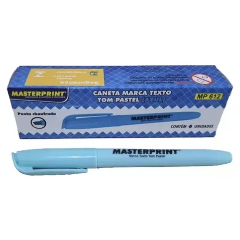 Kit 24 Marca Texto Masterprint Ton Pastel, podem ser 1 unica cor ou variada, escolher variação desejada. Especificações: - Resina termoplástica; - Tinta à base de água sem cheiro; - Ponta fixa que não afunda quando pressionada; - Ponta chanfrada para destacar texto com linha grossa ou sublinhar com linha fina. - ATENÇÃO: As tonalidades de cores podem variar de acordo com as configurações de seu monitor ou celular, as imagens são meramente ilustrativas. O fabricante/fornecedor pode alterar detalhes de cor nos produtos, acessórios, etc, sem aviso prévio.