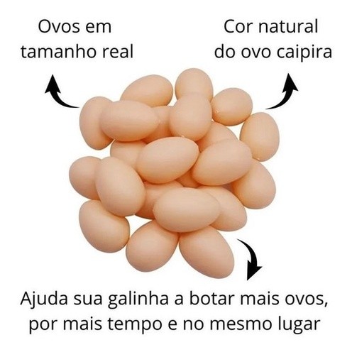 Sua galinha está precisando produzir mais ovos? Esse produto é perfeito para sua galinha para indez, que é um estímulo para que ela volte a pôr ovos naquele mesmo lugar. Garanta sua galinha mais feliz e produtiva com uma dúzia de ovos de mentira. Os ovos são da mesma cor do ovo caipira, sendo idêntico a eles em tamanho, cor e formato. O peso que é diferente pois eles são ocos, sendo assim, mais leves. Eles não amassam facilmente e possuem mesmo tamanho que um ovo "real". Os ovos não abrem. Ficha técnica: Altura: 5cm aproximadamente Largura: 4cm aproximadamente Unidades na entrega: 24 OBS: A galinha que consta nas fotos é meramente ilustrativa. Estão incluídos no envio somente os ovos de plástico.