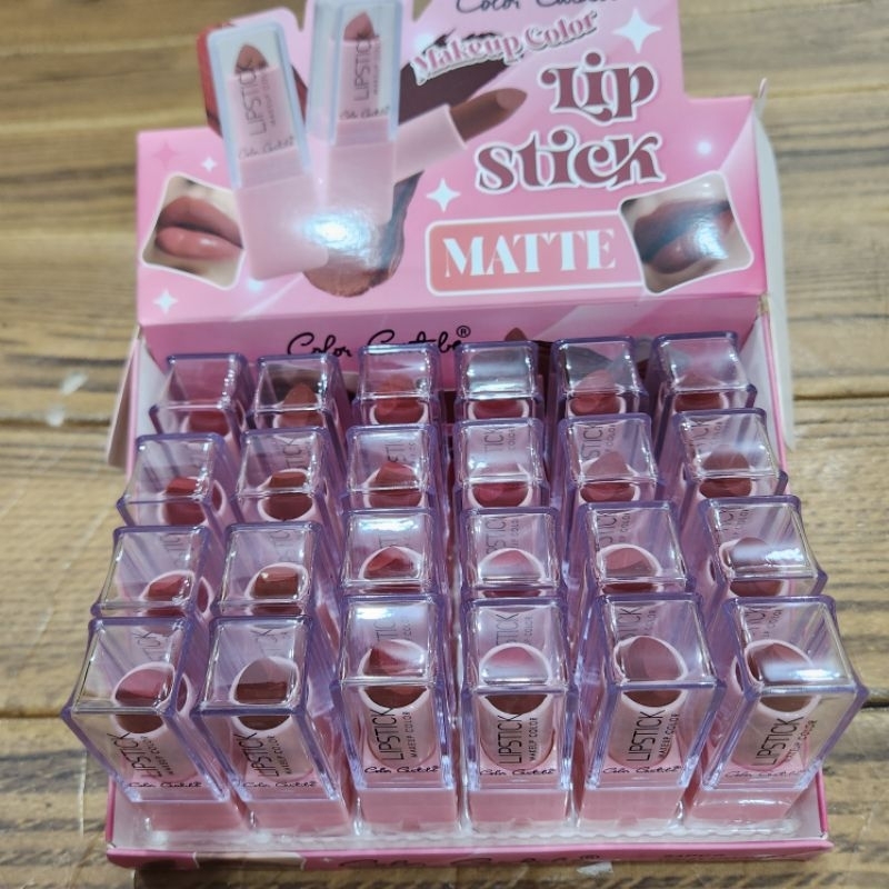 kit 24 peças Batom Matte Lip stick hold lips 1 caixa com 24 peças. Validade: 07/2029 (Lote de momento) Batom em bala com acabamento soft matte. O Batom Lip stick colore os lábios de maneira uniforme, além de garantir uma experiência sensorial leve e confortável.Disponível em 8 opções de cores exclusivas, o Batom Lip stick proporciona fácil aplicação, pigmentação intensa e efeito de longa duração. Com fórmula vegana, cruelty free e livre de parabenos, o produto é ideal para compor os mais diversos looks, já que colore, destaca e define os lábios com rapidez e sofisticação. MODO DE USAR Aplique diretamente sobre os lábios, até obter o efeito desejadoPRECAUÇÕES Uso externo. Uso adulto. Manter fora do alcance de crianças. Não deixar exposto a raios solares e calor.