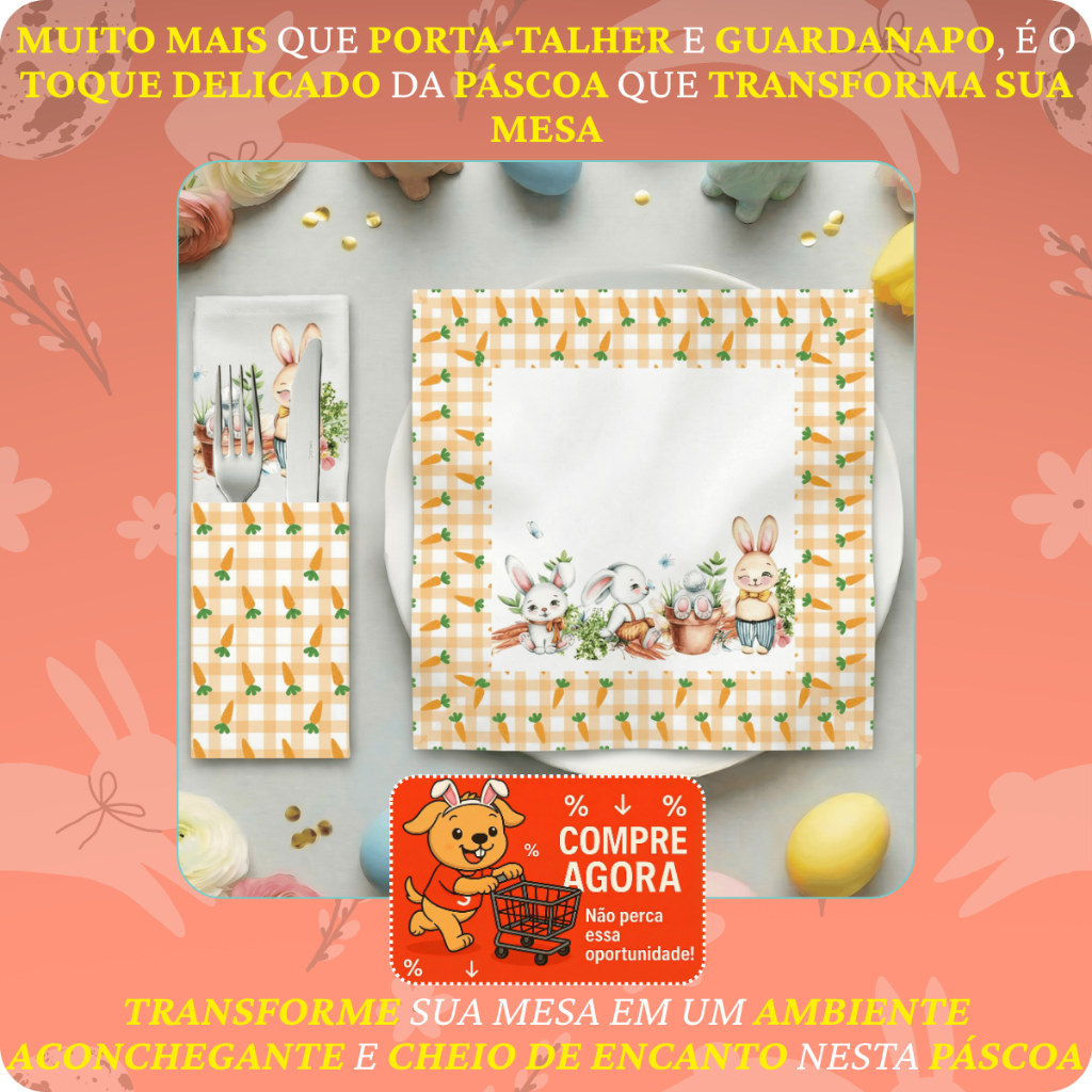 | Kit 24 Peças Páscoa com 12 Guardanapos e 12 Porta Talher Estampa Ex... este produto | R$ 69,99 | 41% | 4.9/5 | 14 |