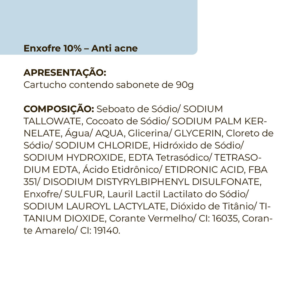 Kit 24 und Sabonete Enxofre Sulfuroso Arte Nativa 90g MODO DE USO: Umedeça a pele e aplique o sabonete de Enxofre na área afetada fazendo movimentos circulares com as mãos. Enxágue a área completamente. Repetir a aplicação 2 a 3 vezes ao dia. Para melhor resultado, recomenda-se o uso diário. FINALIDADE DE USO: Sabonete para pele Acnéica / Abrasivo/ Esfoliante químico. O sabonete de Enxofre auxilia no combate de cravos e espinhas eliminando o excesso de oleosidade. É Essencial para o cuidado diário da pele, pois apresenta em sua composição, 7% de enxofre além de elementos selecionados para o cuidado e limpeza da pele oleosa. Dermatologicamente testado. CUIDADOS DE CONSERVAÇÃO:Mantenha a embalagem bem fechada e ao abrigo do calor excessivo. ADVERTÊNCIAS: Para uso externo apenas. Não usar em crianças. Em caso de irritação, interromper o uso e consultar um médico. Aplicar apenas na área afetada. Mantenha fora do alcance de crianças. Em caso de contato com os olhos, enxágue abundantemente com água. Usar esse produto ao mesmo tempo ou após o uso de medicamento ou outros produtos para acne, pode aumentar a secura ou irritação da pele. Nesses casos, consulte um médico. Evitar exposição ao sol durante o uso (aconselhável o uso do protetor solar). COMPOSIÇÃO:Seboato de Sódio/ SODIUM TALLOWATE, Cocoato de Sódio/ SODIUM PALM KERNELATE, Água/ AQUA, Glicerina/ GLYCERIN, Cloreto de Sódio/ SODIUM CHLORIDE, Hidróxido de Sódio/ SODIUM HYDROXIDE, EDTA Tetrasódico/ TETRASODIUM EDTA, Ácido Etidrônico/ ETIDRONIC ACID, FBA 351/ DISODIUM DISTYRYLBIPHENYL DISULFONATE, Enxofre/ SULFUR, Lauril Lactil Lactilato do Sódio/ SODIUM LAUROYL LACTYLATE, Dióxido de Titânio/ TITANIUM DIOXIDE, Corante Vermelho/ CI: 16035, Corante Amarelo/ CI: 19140.