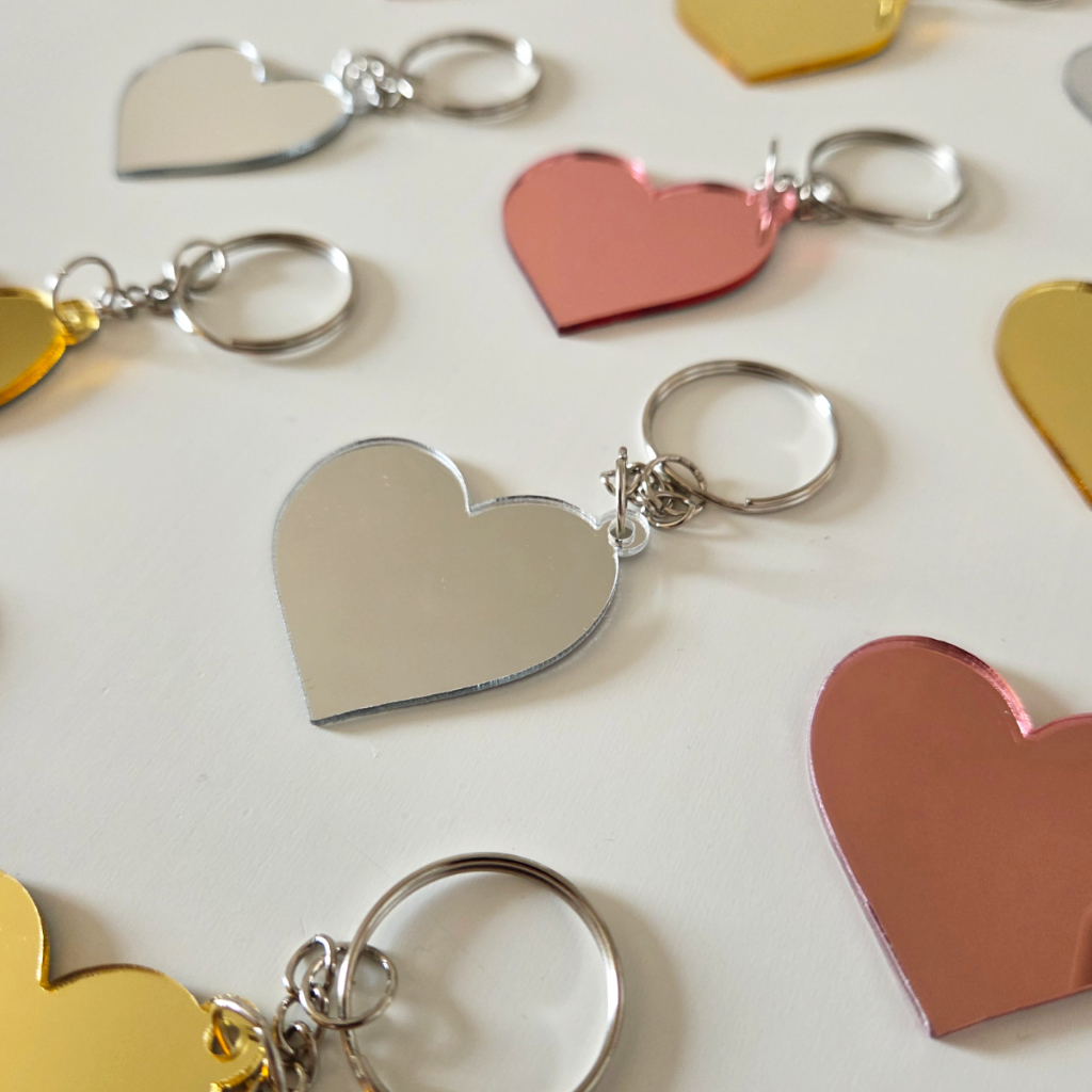 Kit 25/50/100 Chaveiros Coração em Acrílico Espelhado 2mm Prata, Rose Gold e Dourado