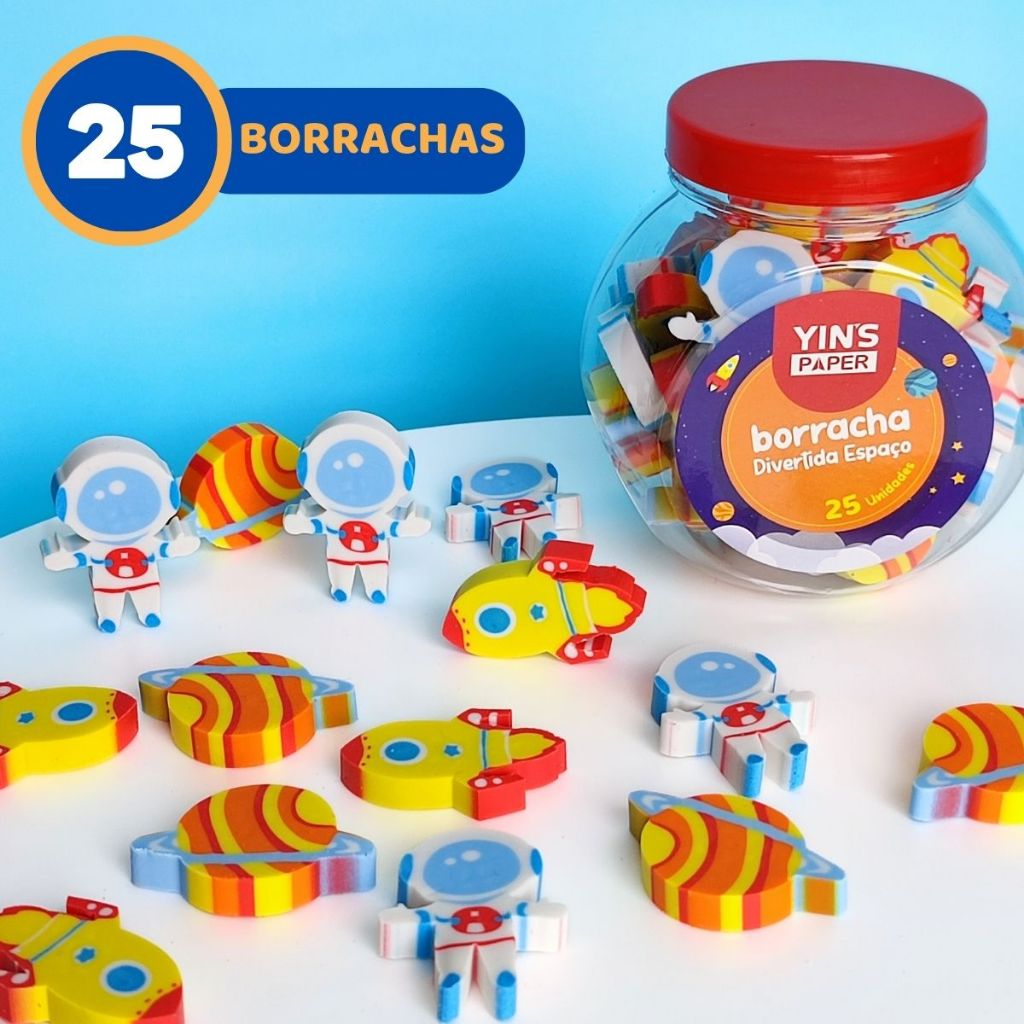 Pote com 25 Borrachas Divertidas – (Espaço ou Frutas) - Selecione antes da compra no próprio anuncio. Deixe o material escolar ainda mais divertido com esse pote recheado de borrachas coloridas e criativas! São 25 unidades com temas: frutinhas fofas ou elementos do espaço, como foguetes, planetas e estrelas 🌟🍉🚀 🧩 Características: Modelos: frutas ou espaço (Selecione antes da compra no próprio anuncio) Medidas: aproximadamente 3 cm cada Material: borracha termoplástica (macia e segura) Registro Inmetro: 007504/2023 ✨ Perfeitas para uso escolar, colecionar ou montar kits criativos. Também são uma ótima opção de lembrancinha para festas infantis, aniversários e eventos escolares!