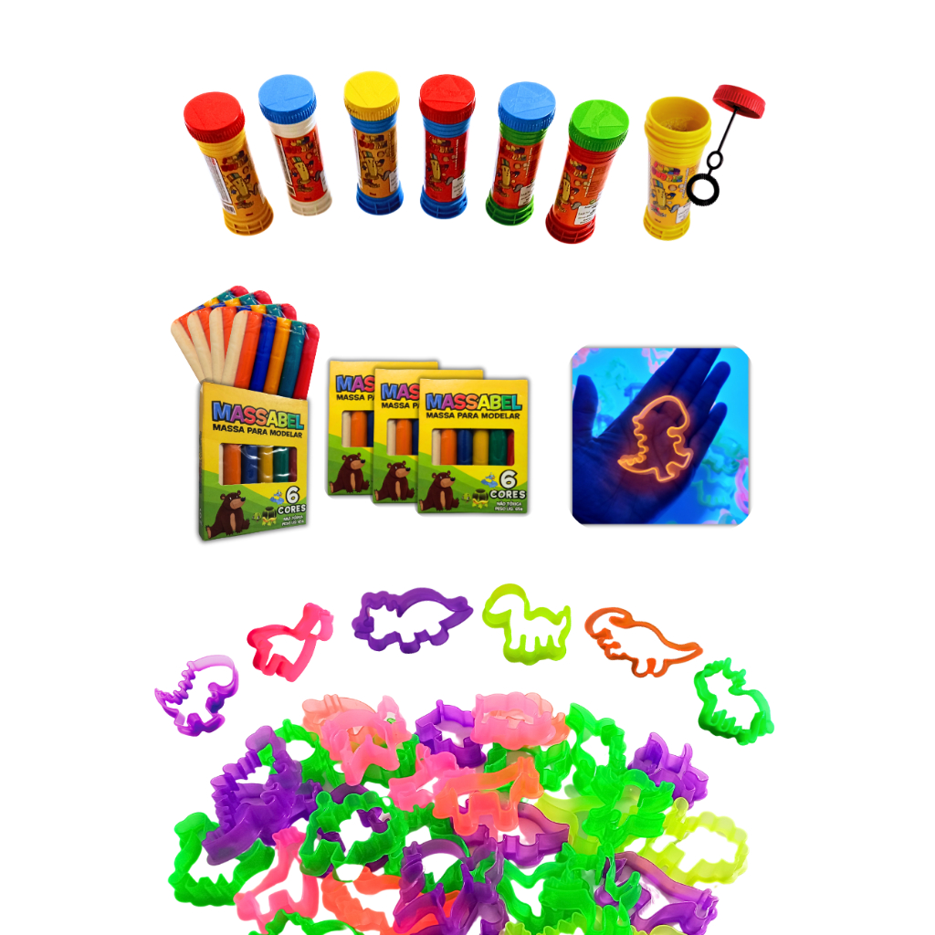 ***ATENÇAO, NAO PERSONALIZAMOS E NEM FABRICAMOS NENHUM PRODUTO. TODOS VAO SORTIDOS NOS MODELOS DAS FOTOS. SEM POSSIBILIDADE DE ESCOLHA DE COR. 25 CAIXINHAS DE GIZ DE CERA 5 CORES (5x4 a caixinha) COMPOSIÇAO: CERAS E PIGMENTOS. 25 CAIXINHAS DE MASSINHAS DE MODELAR 65g 6 CORES (MODELOS DAS FOTOS) DIMENSÕES DA CAIXA DA MASSINHA: 9 CM DE ALTURA 7,4 CM DE COMPRIMENTO 1,5 CM DE LARGURA 25 BOLHA DE SABAO 50ml SORTIDAS. (10cm ALTURA e 3 de Diametro) **NAO PERSONALIZAMOS. **JA VAI COM O LIQUIDO. COMPOSIÇÃO: AMINOÁCIDO, CORANTE E ÁGUA 50 UNIDADES DE CORTADOR DE MASSINHA - FORMINHAS COLORIDOS E SORTIDOS (Mais de 32 Modelos diferentes) ( ANIMAIS SAFARI, DINOSSAUROS E COMUNS ) COLECIONE!!! (há Repetiçoes) Material de plástico Comprimento de 4 a 6 cm Altura 1,5 cm QUALQUER DUVIDA ESTAMOS A DISPOSIÇAO BOLINHA MAGICA