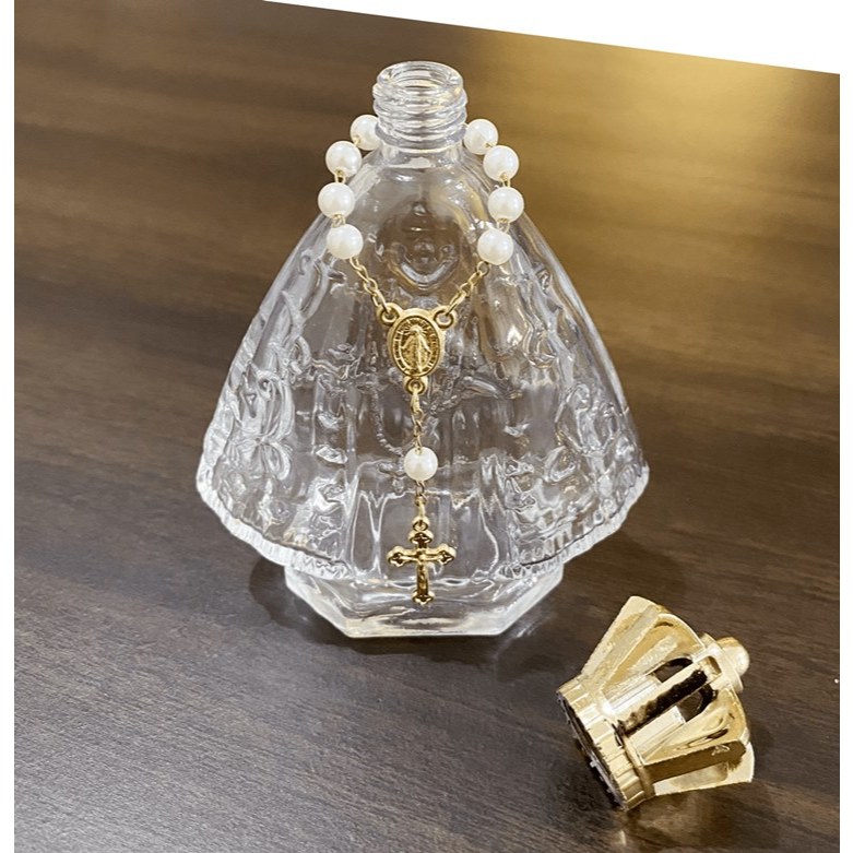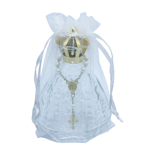 Kit 25 Frascos N. Sra Aparecida + Mini Terços Pérola/Dourado c/ Organza 10x15 – Lembrancinhas