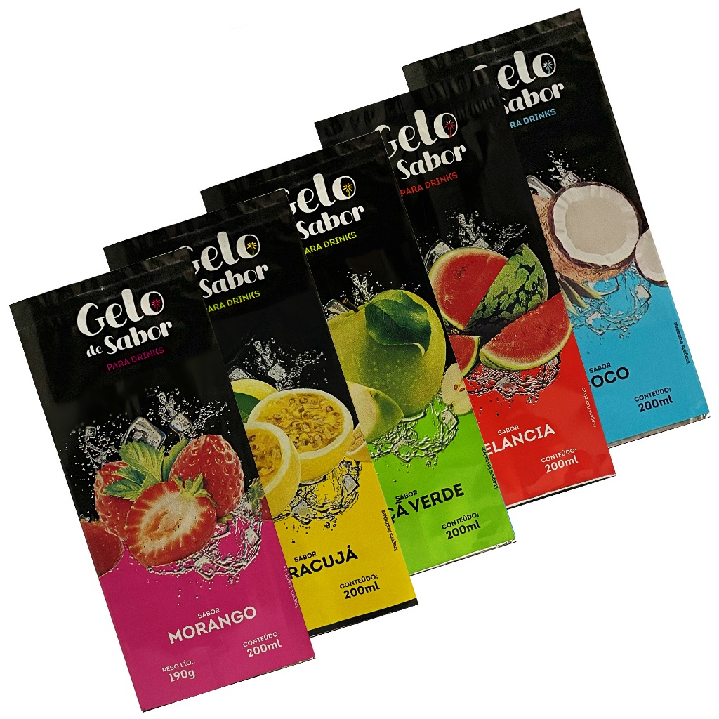KIT 250/500/1000/1250 Embalagens Para Gelo Saborizado 5 Sabores 9x21 cm 190g/200ml Profissionais