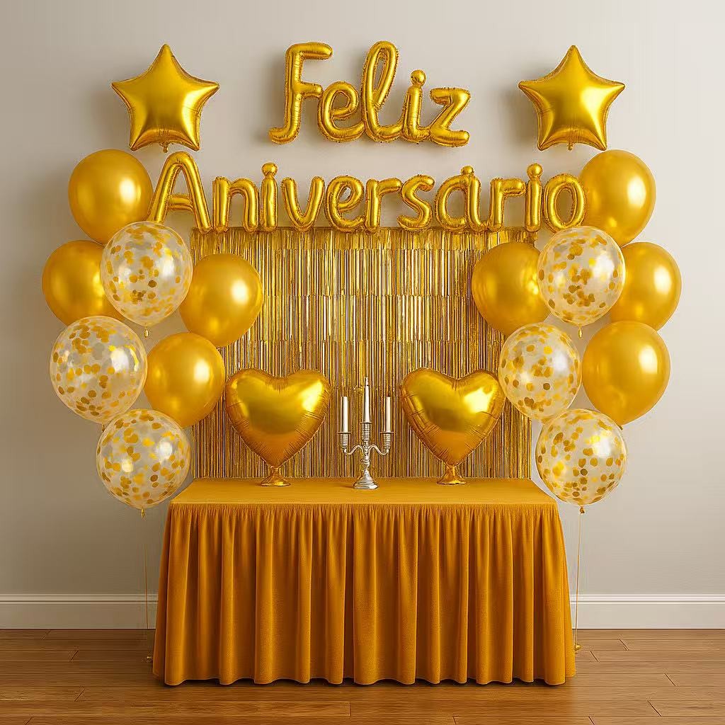 Itens: **2 - pcs Bexigas Coração - Tamanho 18" **2 - pcs Bexigas Estrela - Tamanho 18" **10 - pcs Bexigas Transparente c/ Glitter - Tamanho 12" **10 - pcs Bexigas - Tamanho 10" **1 - Nome Letras Balão - Feliz Aniversario **1 - Cortina Metalizada Fitilhos 2x1 M Balão para Festa, Decoração, Enfeites, Etc... Enche com Ar Normal Balão produzido com componentes de maior duração e brilho! * Cores vibrantes; * Brilho duradouro; * Não irrita a pele. * Não solta tinta e cheiro; * Prazo de Validade Indeterminado; * Possue válvula para encher *Pronta entrega.