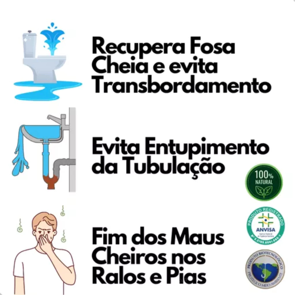 LIMPEZA NOS RALOS, FOSSAS E TUBULAÇÕES DE UMA FORMA SIMPLES E SEM SUJEIRA!BIOL 2000 é um produto a base de microrganismos naturais vivos, que digerem os detritos e outras sujeiras nas fossas e tubulações.Serve para limpar e desobstruir:Ralos e pias;Tubulações de esgoto;Caixas de gordura e fossas sépticas;VANTAGENS DE UTILIZAR O BIOL 2000Limpa sem fazer sujeira a fossa séptica, caixa de gordura e tubulação.Acaba com o mau cheiro da tubulação.Acaba com infestação de ratos, baratas e outros insetos.Não é corrosivo ou cáustico, por isso não danifica a tubulação.Custo acessível, sem precisar usar serviços de desentupidora.Aplicação rápida e segura, faça em menos de 3 minutos.É um produto 100% natural, por isso não agride o meio ambiente.Também pode ser usado para tratamento de resíduos industriais, estabelecimentos comerciais, residências, instalações coletivas, tratamento de chorumes, compostagem, maus odores, controle da DBO, QDO, coliformes totais e fecais.COMO FAZER A APLICAÇÃO:Aplicação deve ser feita a noite ou no último uso do dia (banheiro, pia e ralos)Aplicar 1 dose de durante 4 dias consecutivos.Após o 4º dia as doses podem ser aplicadas a cada 7 dias ou em prazos maiores, conforme a necessidade do local.
