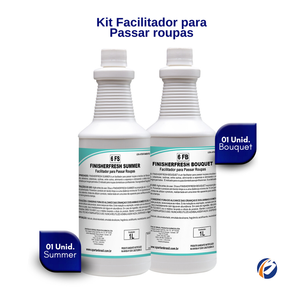 Kit 2und Finalizador de Roupas Finisherfresh 1L cada Spartan Facilitador para passar roupas e tecidos de fibras naturais e sintéticas presentes em toalhas, lençóis, edredons, cobertores, cortinas, entre outros, eliminando a aspereza e otimizando o efeito de passadoria, deixando os tecidos macios e perfumados por longos períodos. É indicado para roupas domésticas e profissionais. Sua fragrância resiste a altas temperaturas. PH: 6,0 Diluição: até 1:10 ESCOLHER: Fragrância: Bouquet Embalagem: 02 unidades de 1L cada Fragrância: Summer Embalagem: 02 unidades de 1L cada Fragrância: Requinte Embalagem: 02 unidades de 1L cada Fragrância: Bouquet e Summer Embalagem: 01 unidade de 1L da fragrância Bouquet + 01 unidade de 1L da fragrância Summer Fragrância: Bouquet e Requinte Embalagem: 01 unidade de 1L da fragrância Bouquet + 01 unidade de 1L da fragrância Requinte Fragrância: Requinte e Summer Embalagem: 01 unidade de 1L da fragrância Requinte + 01 unidade de 1L da fragrância Summer