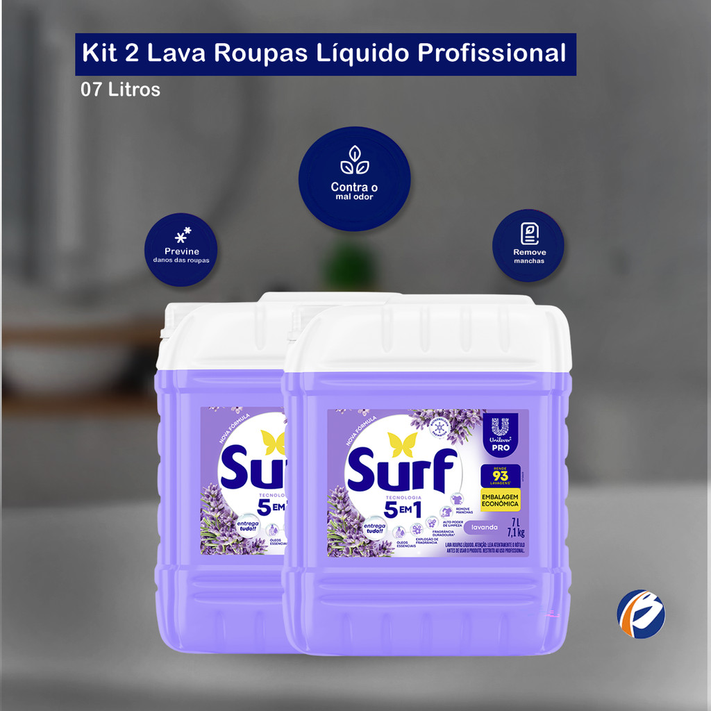 Kit 2und Lava Roupas Líquido Lavanda Profissional Surf 7L cada O Surf 5 em 1 Lavanda é um sabão líquido 7 litros foi desenvolvido com diversas qualidades. Sendo primeira delas o foco na limpeza profunda, graças a sua biotecnologia enzimática vai remover as sujeiras e machas difíceis e garantido que suas roupas fiquem limpas e impecáveis. A segunda qualidade sua fragrância intensa e duradoura que vai deixar suas roupas com perfume agradável de lavanda que dura muito mais tempo em suas roupas. Outra qualidade vai preservação e cuidados com as cores, mantendo suas roupas vibrantes e evitando o desbotamento. Também irá ajudar manter suas roupas brancas mais brilhantes e sem manchas. E por último sendo a mais importante o ótimo custo-benefício trazendo economia, eficiência, praticidade e qualidade profissional para conforto de sua casa! Fragrância: Lavanda Embalagem: 02 galões de 7L cada
