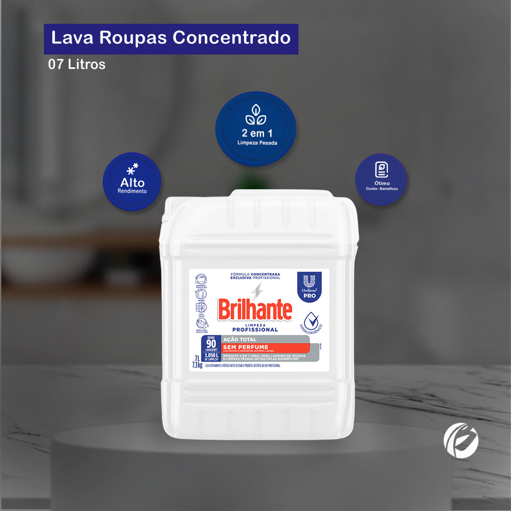 Lava Roupas Líquido Ação Total Sem Perfume 7L Brilhante Brilhante Limpeza Total Rendimento imbatível: 7L rende 500 kg de roupas limpas. Sem perfume e hipoalergênico ¿ não causa irritações à pele. Ideal para uso em serviços de alimentação, como bares e restaurantes.Limpa tecidos e superfícies, como pisos e azulejos. Detergente líquido concentrado de alto desempenho. Embalagem: 02 galões de 7L cada.
