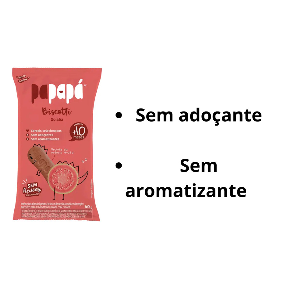 Kit 02 unidades. Biscotti Papapá de Goiaba - 60g Adocicado pela própria fruta, com uma textura macia e formato anatômico para as mãozinhas dos bebês, o Biscotti é uma opção saudável de lanche para oferecer sem culpa aos pequenos, a partir de 10 meses. A linha é feita com cereais selecionados e contém apenas ingredientes naturais (Clean Label). Além disso, não contém açúcar adicionado, conservantes e corantes. Ingredientes: Farinha de trigo enriquecida com ferro e ácido fólico, fécula de mandioca, suco de maçã, óleo de girassol, fibra de chicória, fibra de aveia, goiaba desidratada, beterraba desidratada e fermento químico bicarbonato de sódio. CONTÉM GLÚTEN. Contém: derivados de aveia e trigo. Pode conter: amendoim, avelã, castanha-de-caju, castanha-do-pará, centeio, cevada, leite, macadâmia, nozes e soja. Consumo e Armazenamento: Indicado para bebês a partir dos 10 meses, não havendo restrições para crianças maiores. O produto vem pronto para consumo, deve ser armazenado livre da exposição solar e umidade. Após aberto, se não consumido todo o conteúdo, manter a embalagem fechada. Embalagem: O Biscotti de Goiaba contém 12 unidades. Validade: O Biscotti é válido por 10 meses a partir da data de fabricação.