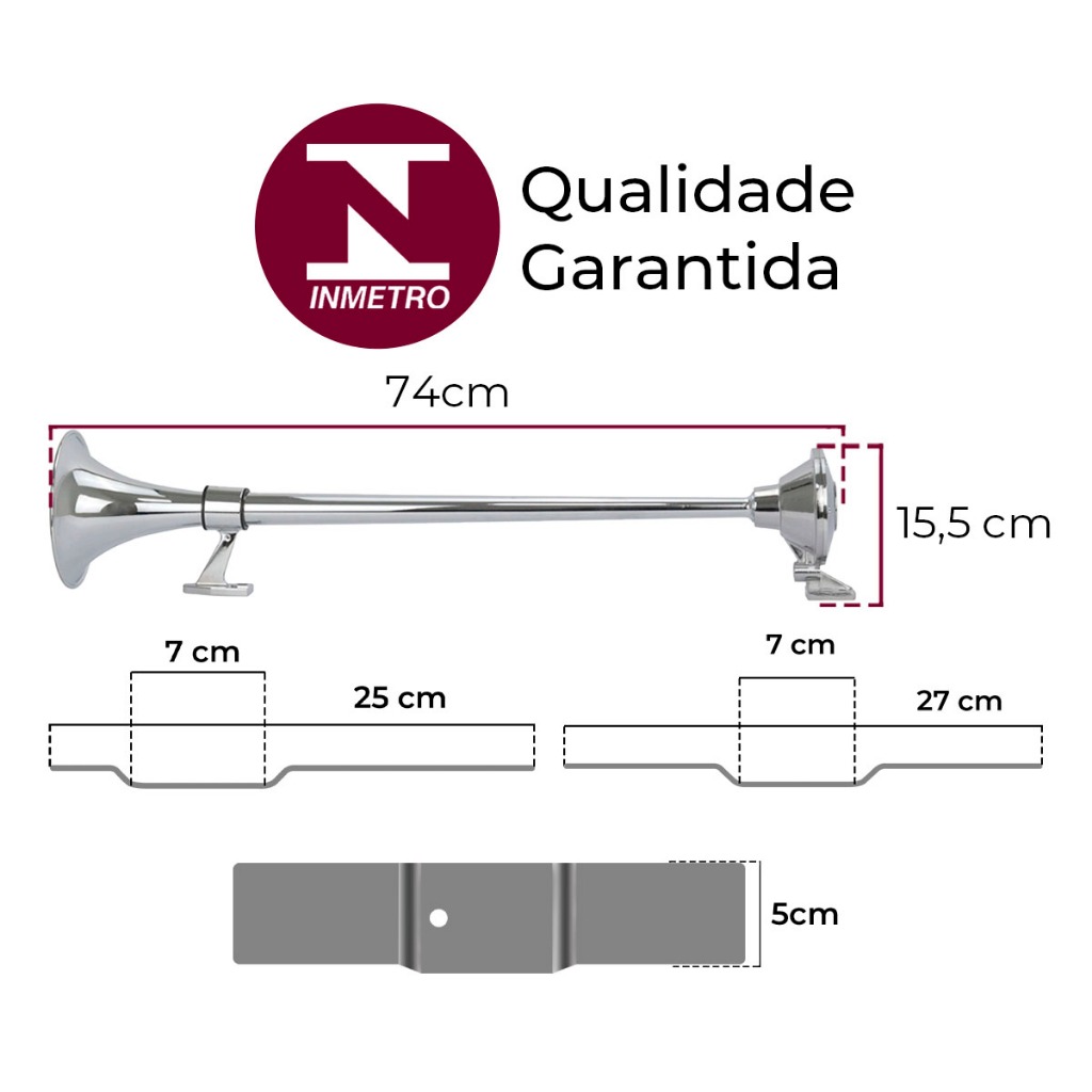 A Buzina Marítima é a solução perfeita para quem necessita de um som potente para seu caminhão. Fabricada com material cromado de alta qualidade, oferece resistência e longa vida útil, além de trazer o toque sofisticado para o seu veículo. Com fácil instalação e grande durabilidade, a buzina emite som MUITO ALTO e claro garantindo a qualidade da marca KAUAI, referência no mercado. 🔰Possui certificação do INMETRO🔰 Ficha Técnica • Modelo: Buzina Marítima 24V Com Válvula Solenoide Acoplada • Tensão: 24V ou 12V (Bivolt) • Intensidade: 150 dB; • Material: Metal Zamak (Anti- Corrosão); • Comprimento: 74cm; • Cor: Cromada; • Marca: Kauai. Itens Inclusos • 02x Cornetas Buzina Marítima 74cm Cromada Kauai Com Válvula Solenoide Bivolt; • 02x Pares Suporte Metal para Buzina 74cm Benefícios ✅ Som MUITO potente que proporciona segurança nas estradas; ✅ Alta resistência à corrosão e intempéries; ✅ Fácil de instalar e usar; ✅ Adequada para TODOS os modelos de caminhão, além de barco e lanchas. Modo de Uso • Determine o local de instalação no veículo, geralmente no topo da cabine de seu caminhão; • Conecte a buzina à fonte de energia apropriada (12V ou 24V). • Verifique o funcionamento correto antes do uso regular. • Sugerimos que a instalação seja realizada por um profissional de sua confiança 🚨 Cuidados com o Produto 🚨 • Assegure-se de usar a voltagem correta para evitar danos. • Limpe regularmente para evitar acúmulo de sujeira. 🚛 Garanta agora mesmo sua buzina marítima 74cm e siga viagem com a garantia de um som potente 🚛 ○○○○○○○○○○○○○○○○○○○○○○○○○○○○○○○○○○○○○○○○○○○○○○○○ A Ninja Parts, fundada em 2016 em Curitiba-PR, é um e-commerce referência nacional em peças e acessórios automotivos. Oferecemos as melhores marcas com qualidade e envio rápido, priorizando a satisfação do cliente e um excelente atendimento. Garantia • 90 dias a partir da data da compra; • Garantia válida apenas para defeitos de fábrica. Não é coberto mau uso, má instalação, quebra ou adaptações que alterem características originais do produto; Trocas e Devoluções • Importante que todos os itens sejam enviados nas embalagens originais de forma segura; • Caso o produto retorne danificado, os custos ficarão sob responsabilidade do cliente; Recomendação • A instalação seve ser realizada por um profissional de sua confiança; Compra Garantida • Transação Segura; • Estorno automático em caso de imprevistos;