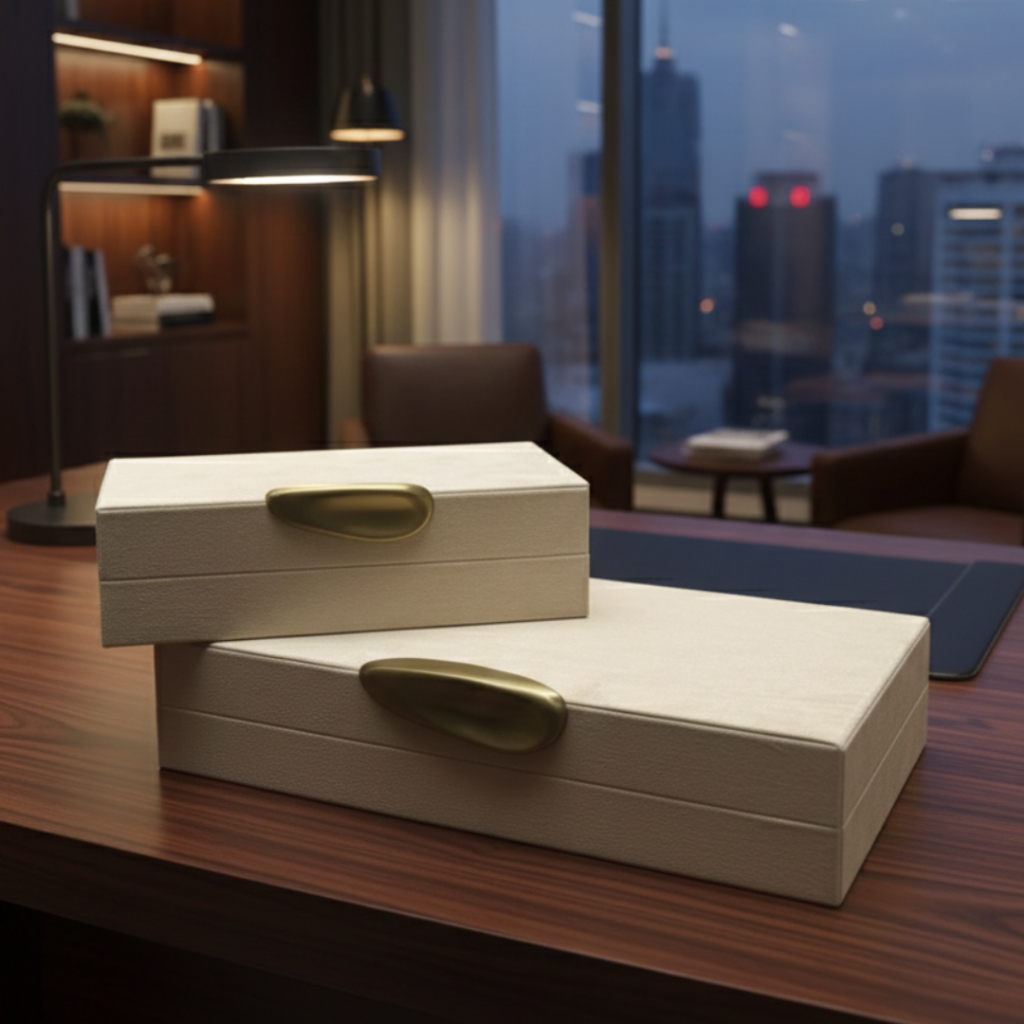 Kit 2x Caixas Decorativas Veludo Branco Marfim em MDF e PU Escritório, Consultório, Sala, Organização e Decoração