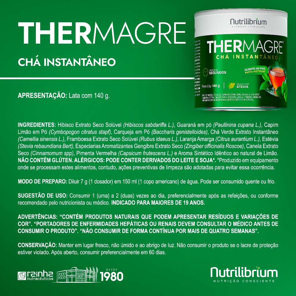 THERMAGRE CHÁ INGREDIENTES: Hibisco Extrato Seco Solúvel, Guaraná em pó, Capim Limão em Pó, Carqueja em Pó, Chá Verde Extrato Instantâneo, Framboesa Extrato Seco Solúvel, Laranja Amarga, Estévia, Especiarias Aromatizantes Gengibre Extrato Seco, Canela Extrato Seco, Pimenta Vermelha e Aroma Sintético Idêntico ao natural de Limão. NÃO CONTÉM GLÚTEN. ALÉRGICOS: PODE CONTER AIPO E MOS-TARDA. MODO DE PREPARO: Diluir 7 g (1 scoop) em 150 ml (1 copo americano) de água. Pode ser consumido quente ou frio. SUGESTÃO DE USO: Consumir 1 (uma) à 2 (duas) vezes ao dia, preferencialmente após as refeições, ou conforme recomendado pelo nutricionista ou médico. INDICADO PARA MAIORES DE 19 ANOS. ADVERTÊNCIAS: “CONTÉM PRODUTOS NATURAIS QUE PODEM APRESENTAR RESÍDUOS E VARIAÇÕES DE COR”. “PORTADORES DE ENFERMIDADES HEPÁTICAS OU RENAIS DEVEM CONSULTAR O MÉDICO ANTES DE CONSUMIR O PRODUTO”. “NÃO CONSUMIR DE FORMA CONTÍNUA POR MAIS DE QUATRO SEMANAS”. CONSERVAÇÃO: Manter em lugar fresco, não úmido e ao abrigo de luz. Não consumir o produto se o lacre estiver violado. Após aberto, consumir preferencialmente em 60 dias.