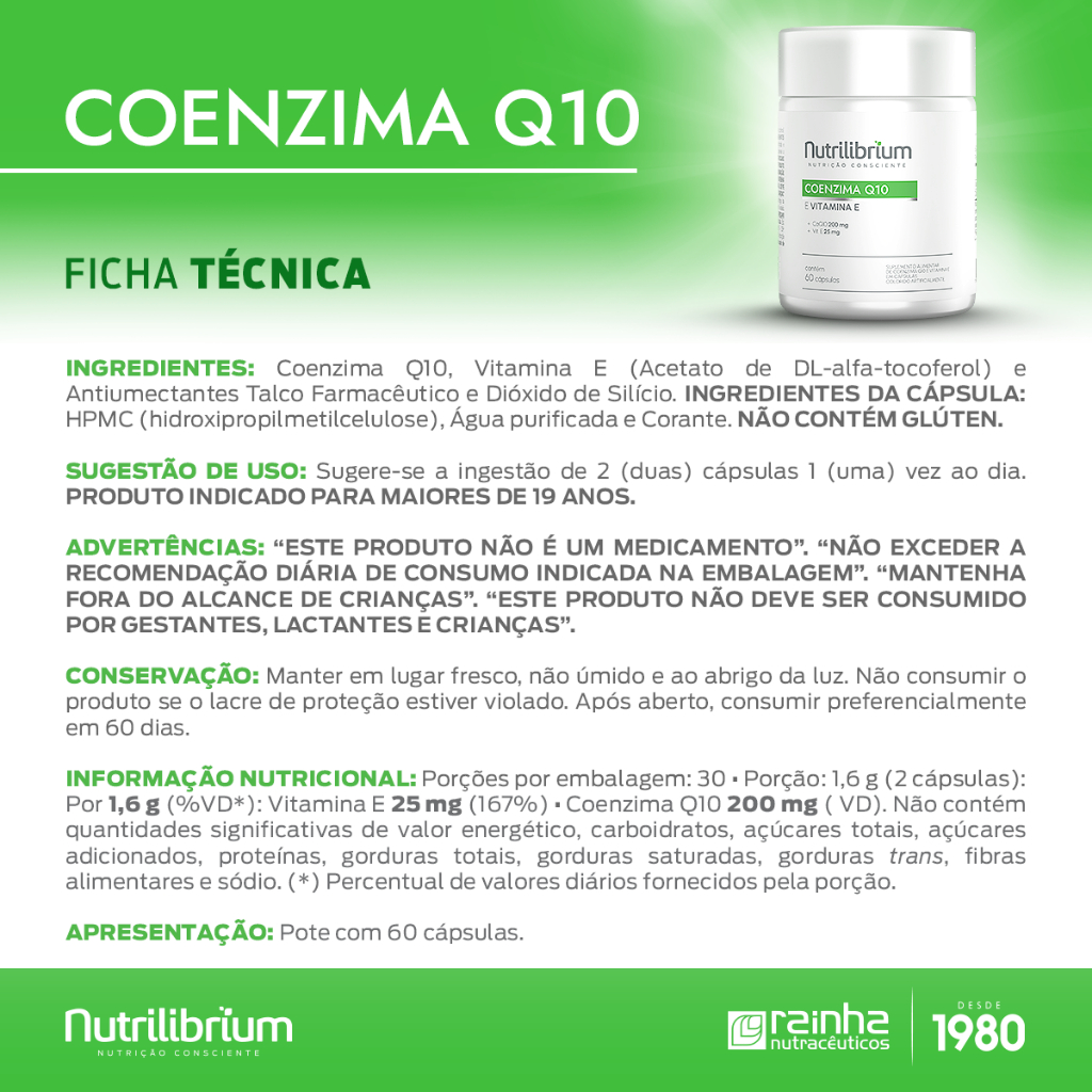 COENZIMA Q10 E VITAMINA E INGREDIENTES: Coenzima Q10, Vitamina E (Acetato de DL-alfa-tocoferol) e Antiumectantes Talco Farmacêutico. INGREDIENTES DA CÁPSULA: HPMC (hidroxipropilmetilcelulose), Água purificada e Corante. NÃO CONTÉM GLÚTEN. SUGESTÃO DE USO: Sugere-se a ingestão de 2 (duas) cápsulas 1 (uma) vez ao dia. PRODUTO INDICADO PARA MAIORES DE 19 ANOS. ADVERTÊNCIAS: “ESTE PRODUTO NÃO É UM MEDICAMENTO.” “NÃO EXCEDER A RECOMENDAÇÃO DIÁRIA DE CONSUMO INDICADA NA EMBALAGEM.” “MANTENHA FORA DO ALCANCE DE CRIANÇAS.” “ESTE PRODUTO NÃO DEVE SER CONSUMIDO POR GESTANTES, LACTANTES E CRIANÇAS”. CONSERVAÇÃO: Manter em lugar fresco, não úmido e ao abrigo da luz. Não consumir o produto se o lacre de proteção estiver violado. Após aberto, consumir preferencialmente em 60 dias.