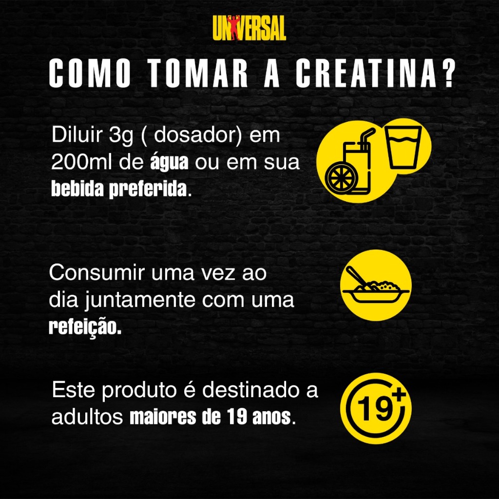Benefícios - Mais força; - Mais energia: reposição rápida dos níveis de Atp; - Melhor desempenho físico; - Ganho de Massa Muscular; • Aumento na resistência a fadiga • Acelera o processo de recuperação • Aumento no volume muscular • Aumento de força • Melhora a performance nos treinos • Energia muscular • Ganho de massa muscular Destaque •100% Creatina •Sem aditivos artificiais •0 g gorduras •0 g carboidratos •Glúten Free •Pode ser consumidor por vegetarianos e veganos ***Para que Serve??? A suplementação com Creatina Universal auxilia no aumento dos estoques e no armazenamento da creatina dentro do músculo, o que é fundamental para a produção da energia usada na contração muscular. Quanto maior for a capacidade de contração muscular de uma pessoa, maior será sua capacidade de realizar treinos intensos ou volumosos. Treinos intensos ou volumosos são necessários para quem deseja ganhar força e massa muscular. Assim, Creatina Universal é um suplemento indispensável para quem deseja ganho de força e massa muscular. ***Como e quando Tomar??? A Creatina Universal pode ser utilizada antes ou após os treinos, assim como em qualquer outro período do dia. O uso da Creatina deve ser feito preferencialmente com carboidratos de alto índice glicêmico, para aumentar a retenção da creatina dentro do músculo. A suplementação de creatina tem como base o efeito crônico, ou seja, é necessário usar a creatina em dias consecutivos, independente ou não de ter treinado naquele dia. É importante frisar que não existe relação do uso de creatina com a retenção hídrica, pois a creatina tem efeito dentro do músculo, e não fora, como se acreditava antigamente. SUGESTÃO DE CONSUMO Diluir a porção de 3 g (1 dosador), em bebida de sua preferência e consumir uma vez ao dia, ou conforme orientação profissional. INGREDIENTES: Creatina Monoidratada em pó. NÃO CONTÉM GLÚTEN. RECOMENDAÇÕES: Conservar este produto ao abrigo de luz, calor e umidade. ANVISA: Registro ISENTO conforme resolução RDC 27 de 06 de agosto de 2010 anexo I.