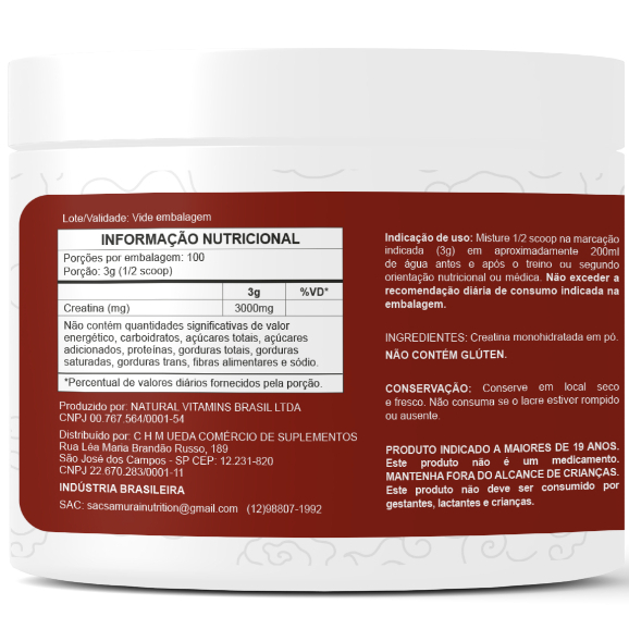 Descubra o poder da Creatina Samurai Nutrition e leve seus treinos a novos níveis! Desenvolvida para auxiliar a alcançar o máximo desempenho, a Creatina Samurai Nutrition é sua aliada para conquistar resultados extraordinários. Aumente sua força, potência e resistência com confiança. Experimente agora e eleve seus ganhos para o próximo nível! ------------------------------------------------------------------ Benefícios da Creatina Samurai Nutrition: ------------------------------------------------------------------ - Aumento da Força - Melhora do Desempenho - Aumento da Massa Muscular - Recuperação Mais Rápida - Benefícios Cognitivos ------------------------ MODO DE USO: ------------------------ Diluir 1/2 scoop na marcação indicada (3g) em aproximadamente 200ml de água antes e após o treino ou segundo orientação médica ou nutricional. Não exceder a recomendação diária de consumo indicada na embalagem. ------------------------- INGREDIENTES: ------------------------- Creatina monohidratada em pó. NÃO CONTÉM GLÚTEN.