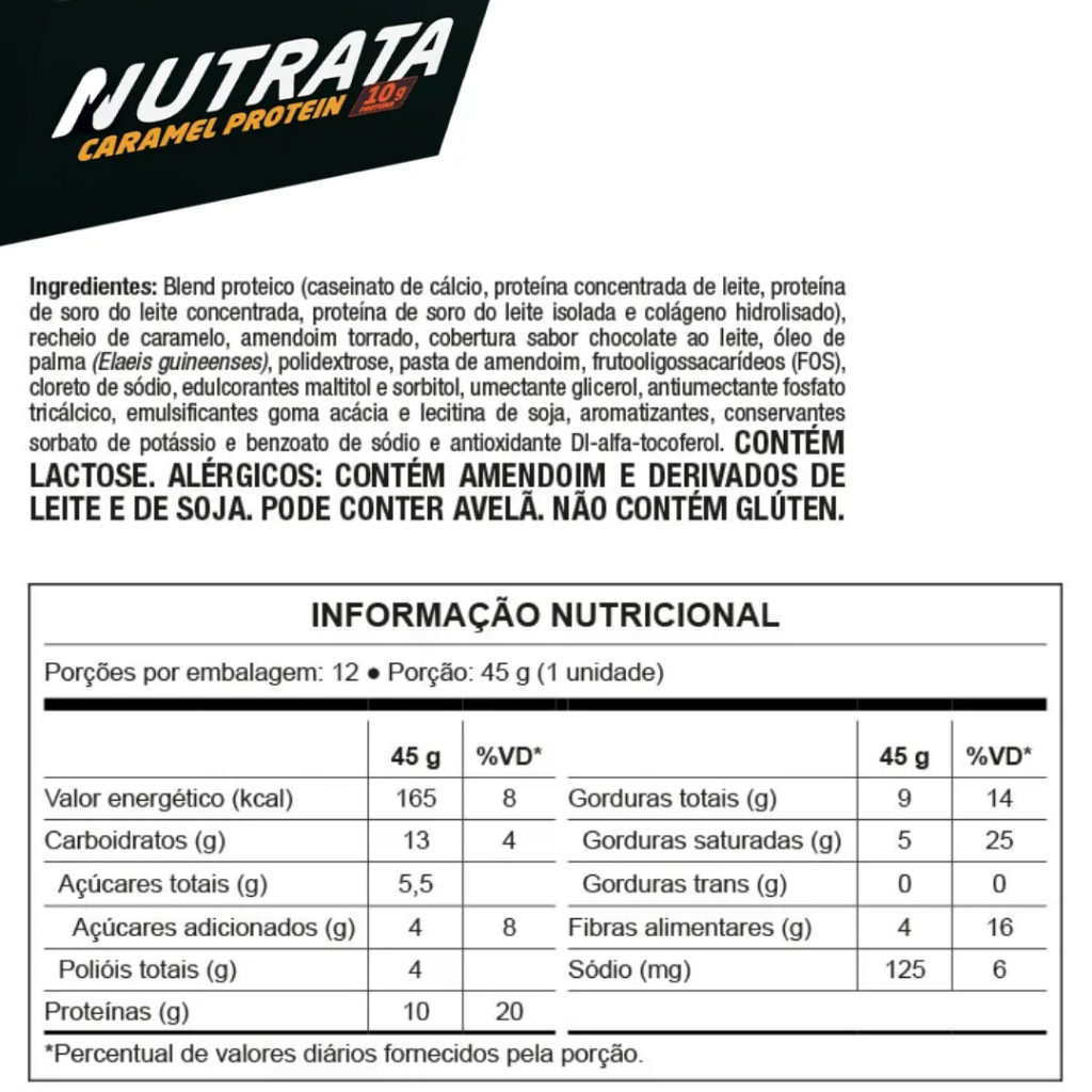 Dark Caramel ou Caramel Protein O Combo Perfeito: Chocolate + Amendoim + Caramelo + Whey Protein Nutrata Caramel é uma barra de proteína com recheio macio de caramelo, amendoim crocante e uma incrível cobertura de chocolate. Deliciosa e muito mais nutritiva do que um chocolate comum, é perfeita para o dia a dia. ------------------ Benefícios ------------------ 10 g de proteínas; Deliciosa cobertura de chocolate; Recheio de caramelo macio e amendoim crocante; Blend de proteínas de alto valor biológico; Com whey protein; 50% menos carboidratos que um chocolate comum; 78% menos açúcar que um chocolate comum; 0 gordura trans; Sem adoçantes artificiais. -------------------------- INGREDIENTES -------------------------- Blend proteico (caseinato de cálcio, proteína concentrada de leite, proteína de soro do leite concentrada, proteína de soro do leite isolada e colágeno hidrolisado), recheio de caramelo, amendoim torrado, cobertura sabor chocolate meio amargo, óleo de palma (Elaeis guineenses), polidextrose, pasta de amendoim, frutooligossacarídeos (FOS), cloreto de sódio, edulcorantes maltitol e sorbitol, umectante glicerol, antiumectante fosfato tricálcico, emulsificantes goma acácia e lecitina de soja, aromatizantes, conservantes sorbato de potássio e benzoato de sódio e antioxidante Dl-alfa-tocoferol. CONTÉM LACTOSE. ALÉRGICOS: CONTÉM AMENDOIM E DERIVADOS DE LEITE E DE SOJA. PODE CONTER AVELÃ. NÃO CONTÉM GLÚTEN.