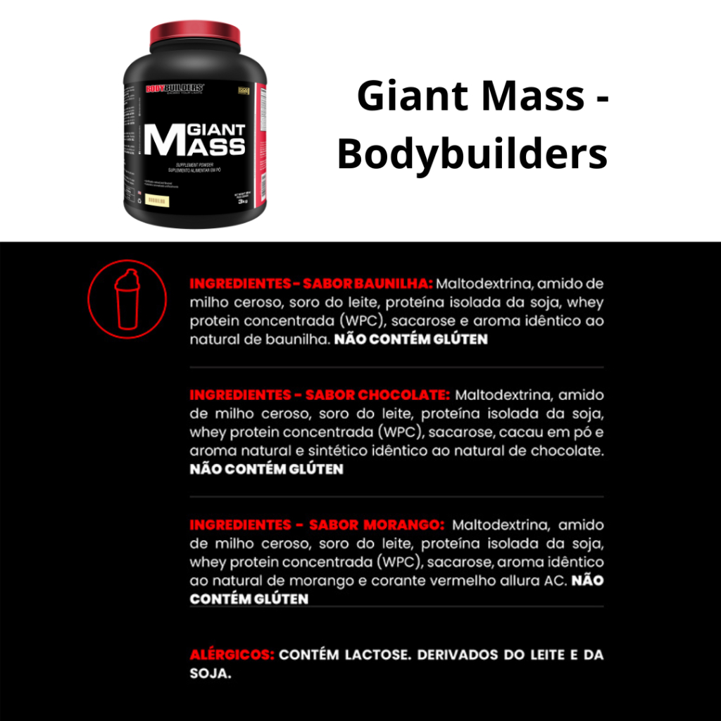 O que é Giant Mass Um suplemento hipercalórico altamente energético com uma alta concentração de proteínas e carboidratos de alto valor biológico. Cerca de 80% do suplemento é composto por carboidratos de rápida digestão, sendo os demais proteínas, vitaminas e minerais. Para que é utilizado o suplemento hipercalórico? Os suplementos hipercalóricos foram desenvolvidos para pessoas com dificuldade em ganhar massa muscular, e peso corporal como aquelas com biotipo ectomorfo. Enquanto a maioria da população transforma o excesso de calorias dos alimentos em reservas de gordura, algumas pessoas usam esse excesso para manter seu metabolismo e, portanto, não conseguem transformá-lo em musculos. Composição Costuma-se dizer que o suplemento hipercalórico é composto de macro e micronutrientes, ou seja, nutrientes necessários em grandes quantidades, como carboidratos, proteínas e gorduras, e aqueles necessários em concentrações menores, como vitaminas e minerais. A composição do suplemento hipercalórico é geralmente de aproximadamente 80% de carboidratos, 10% de proteínas de fácil absorção e 5 a 10% de gorduras. Carboidratos O corpo precisa de glicose para absorver proteínas, e duas das melhores fontes de nutrientes para quem treina são Waxy Maize e a maltodextrina. Por apresentarem pool de carboidratos de baixo e alto índice glicêmico, ambas são assimiladas pelo sistema digestivo gradualmente conforme a necessidade do aporte que o corpo precisa e podem ser considerados uma maneira eficiente e barata de obter uma grande quantidade de calorias em pouco tempo. Proteínas Mesmo que seu objetivo seja ganhar peso, você não vai querer ficar gordo, certo? É por isso que o suplemento hipercalórico contém proteínas de alto valor biológico (como a proteína do soro de leite), a fim de facilitar o controle glicêmico e impedir que a insulina armazene excesso de energia como lipídios no sangue. Por que usar um suplemento hipercalórico como o Giant Mass? O hipercalórico como complemento para ganhar peso tem a vantagem de que em poucas colheres você consegue uma alta concentração de energia que só poderia ser obtida com o consumo de uma grande quantidade de alimentos. Embora consumir alimentos naturais seja sempre a melhor opção, essa tarefa pode ficar um pouco mais difícil quando seu objetivo é consumir mais de 3.000 calorias por dia. Indicação Os suplementos hipercalóricos são indicados para quem tem metabolismo muito rápido e não consegue ganhar massa muscular facilmente, mantendo uma dieta rica em carboidratos. Os hipercalóricos também podem ser usados por praticantes de atividade física que consomem muita energia ao longo do dia e acham difícil reabastecer essas calorias apenas através da dieta. Contra-indicações Se você está tentando perder peso ou precisa monitorar de perto, o suplemento hipercalórico pode não ser uma boa adição à sua dieta. Como tomar Você pode tomar o suplemento hipercalórico Giant Mass com água, suco de frutas, leite, etc.A quantidade exata do suplemento dependerá dos seus objetivos, mas geralmente uma porção de 60 a 100 gramas é geralmente a mais indicada* lembrando que o valor calórico pode alterar de acordo com o tipo de bebida que você misturá-lo. Melhor hora para tomar o suplemento hipercalórico Uma pergunta bem comum entre os praticantes de musculação é se devem tomar o hipercalórico antes ou após o treino ou se é bom tomar hipercalórico antes de dormir. Ao contrário da proteína de soro de leite, que é melhor consumida no pós-treino, não existe um momento ideal para tomar o suplemento hipercalórico, pois seu uso dependerá de fatores como sua dieta e outros suplementos que você já está usando. Além disso, é claro, é sempre melhor que a maioria das calorias diárias seja proveniente de alimentos ricos em proteínas e carboidratos. Consulte um médico ou nutricionista para obter uma orientação adequada às suas necessidades.