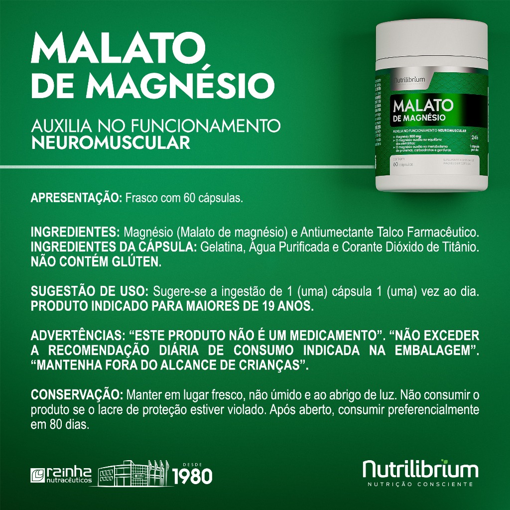 MALATO DE MAGNÉSIO - O magnésio auxilia no funcionamento neuromuscular; - O magnésio auxilia no processo de divisão celular; - Fonte de magnésio.; - O magnésio auxilia no equilíbrio dos eletrólitos; - O magnésio auxilia no metabolismo de proteínas, carboidratos e gorduras. INGREDIENTES: Magnésio (Malato de Magnésio) e Antiumectante Talco Farmacêutico. INGREDIENTES DA CÁPSULA: Gelatina, Água purificada e Corante Dióxido de Titânio. NÃO CONTÉM GLÚTEN. SUGESTÃO DE USO: Sugere-se a ingestão de 1 (uma) cápsula 1 (uma) vez ao dia. PRODUTO INDICADO PARA MAIORES DE 19 ANOS. ADVERTÊNCIAS: “ESTE PRODUTO NÃO É UM MEDICAMENTO.” “NÃO EXCEDER A RECOMENDAÇÃO DIÁRIA DE CONSUMO INDICADA NA EMBALAGEM.” “MANTENHA FORA DO ALCANCE DE CRIANÇAS.” CONSERVAÇÃO: Manter em lugar fresco, não úmido e ao abrigo da luz. Não consumir o produto se o lacre de proteção estiver violado. Após aberto, consumir preferencialmente em 60 dias.