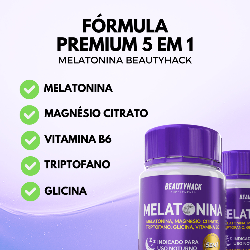 KIT COM 2 POTES DE MELATONINA BEAUTYHACK – FÓRMULA AVANÇADA COM 5 INGREDIENTES EM 1🏆 COMPOSIÇÃO: ✅ Melatonina: conhecida como 'hormônio do sono', participa dos processos naturais ligados ao descanso. ✅ Magnésio Citrato: contribui para o relaxamento muscular e o sistema nervoso. ✅ Triptofano: participa da produção natural de melatonina e está associado à sensação de bem-estar. ✅ Glicina: aminoácido que auxilia nos processos de relaxamento e descanso. ✅ Vitamina B6: participa de processos naturais relacionados ao equilíbrio do corpo. 💊 60 cápsulas por pote | Não contém glúten. A Melatonina da BeautyHack foi desenvolvida para quem valoriza noites tranquilas e uma rotina equilibrada. Sua fórmula reúne ricos nutrientes reconhecidos por participarem de processos naturais do corpo ligados ao descanso e ao bem-estar. DIFERENCIAIS: • Produzido com matéria prima de alta de qualidade • Fórmula avançada com nutrientes combinados • Produzido com padrões rigorosos de segurança • Perfeito para incluir na rotina noturna 📋MODO DE USO: • Ingerir 2 cápsulas ao dia 30 minutos antes de dormir, ou conforme orientação profissional. 🚚 Envio rápido e embalagem segura |🛡️ Produto com padrão de qualidade BeautyHack.