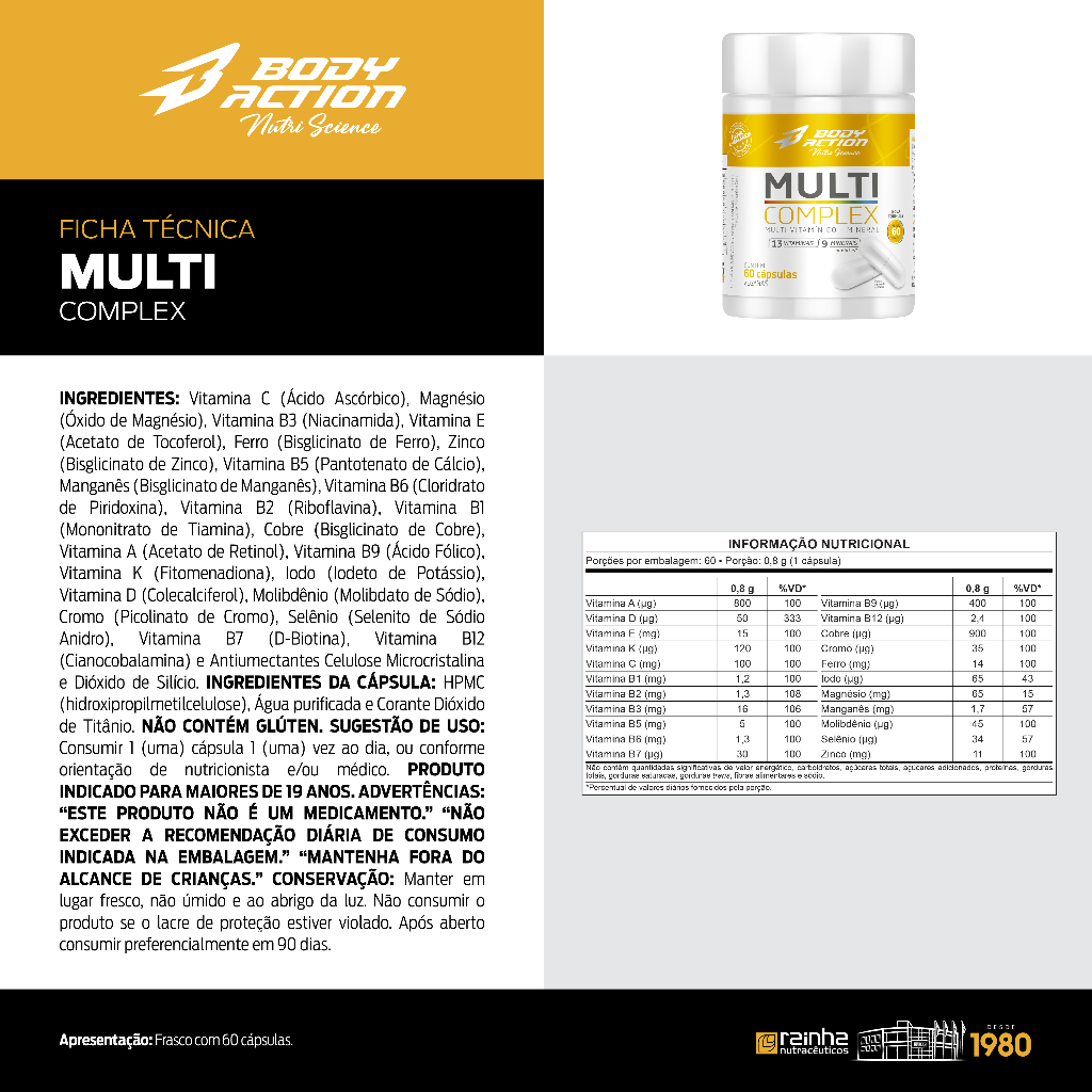 MULTICOMPLEX - Nova fórmula com ferro, zinco, manganês e cobre em suas formas mais biodisponíveis, ligados a quelatos; - Rende 60 dias; - Agora com Vitamina K; - 13 Vitaminas & 9 Minerais; INGREDIENTES: Vitamina C (Ácido Ascórbico), Magnésio (Óxido de Magnésio), Vitamina B3 (Niacinamida), Vitamina E (Acetato de Tocoferol), Ferro (Bisglicinato de Ferro), Zinco (Bisglicinato de Zinco), Vitamina B5 (Pantotenato de Cálcio), Manganês (Bisglicinato de Manganês), Vitamina B6 (Cloridrato de Piridoxina), Vitamina B2 (Riboflavina), Vitamina B1 (Mononitrato de Tiamina), Cobre (Bisglicinato de Cobre), Vitamina A (Acetato de Retinol), Vitamina B9 (Ácido Fólico), Vitami-na K (Fitomenadiona), Iodo (Iodeto de Potássio), Vitamina D (Colecalciferol), Molibdênio (Molibdato de Sódio), Cromo (Picolinato de Cromo), Selênio (Selenito de Sódio Anidro), Vitamina B7 (D-Biotina), Vitamina B12 (Cianocobalamina) e Antiumectantes Celulose Microcristalina. INGREDIENTES DA CÁPSULA: HPMC (hidroxipropilmetilcelulose), Água purificada e Corante Dióxido de Titânio. NÃO CONTÉM GLÚTEN. MODO DE USO: Consumir 1 (uma) cápsula 1 (uma) vez ao dia, ou conforme orientação de nutri-cionista e/ou médico. PRODUTO INDICADO PARA MAIORES DE 19 ANOS. ADVERTÊNCIAS: “ESTE PRODUTO NÃO É UM MEDICAMENTO.” “NÃO EXCEDER A RE-COMENDAÇÃO DIÁRIA DE CONSUMO INDICADA NA EMBALAGEM.” “MANTENHA FORA DO ALCANCE DE CRIANÇAS.” CONSERVAÇÃO: Manter em lugar fresco, não úmido e ao abrigo da luz. Não consumir o produto se o lacre de proteção estiver violado. Após aberto consumir preferencialmente em 90 dias.