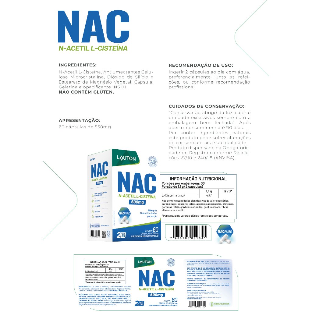 Kit 2x Nac N-Acetil L-Cisteína 600mg Por Porção (60 cápsulas) - Lauton