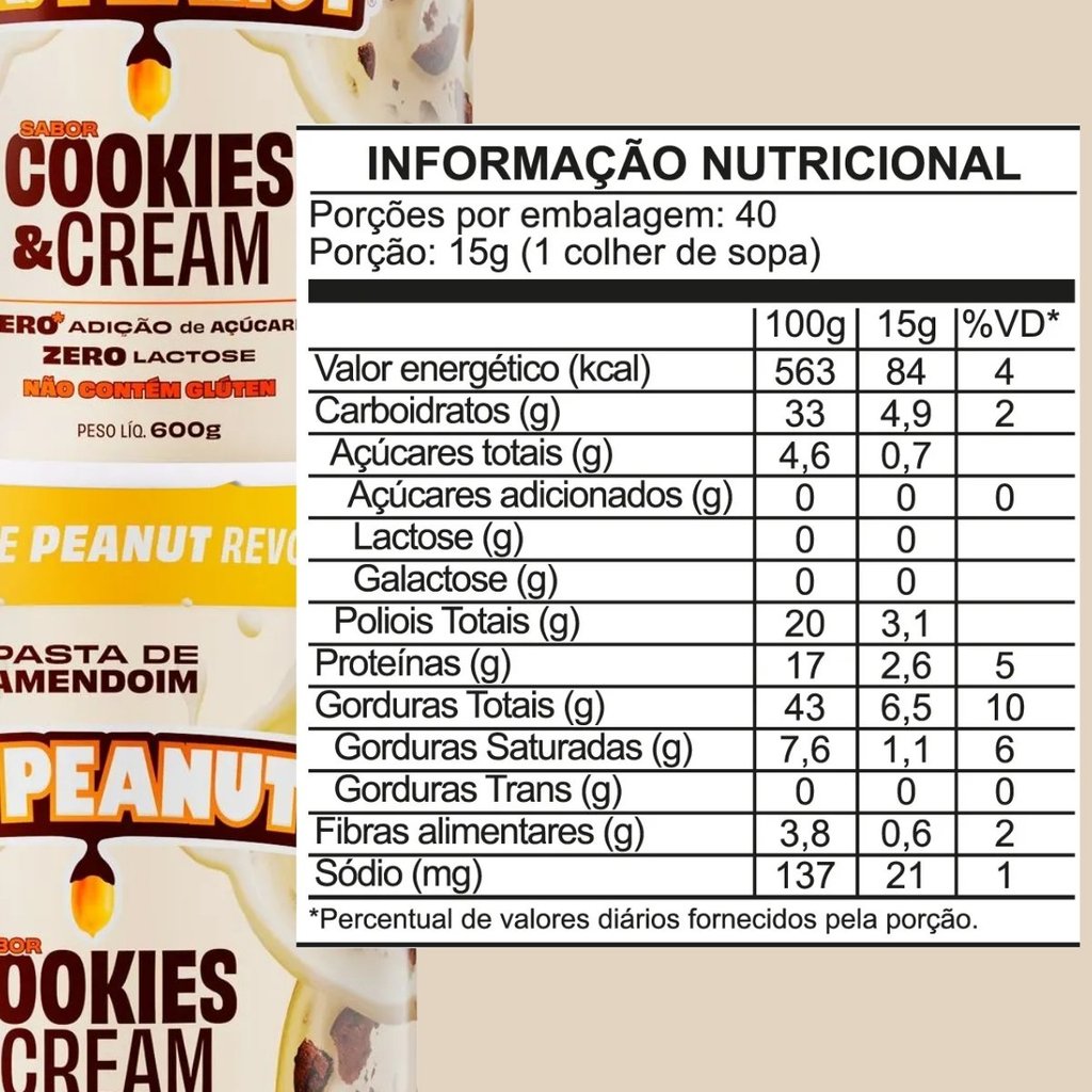 Kit 2x Pasta De Amendoim 1,2Kg Cookies And Cream Dr Peanut Cookies & Cream: Uma Verdadeira Delícia em Cada Colherada! • Prepare-se para uma explosão de sabor com a Pasta de Amendoim Cookies & Cream da Dr. Peanut. Com pedacinhos crocantes de cookies, zero adição de açúcar e zero glúten, ela é perfeita para quem busca um equilíbrio entre nutrição e prazer sem abrir mão do sabor irresistível. • Cremosa e crocante na medida certa, pode ser apreciada pura, como recheio de sobremesas ou até mesmo em receitas criativas para deixar seu dia ainda mais gostoso. Ingredientes: Amendoim torrado, creme sabor chocolate branco (óleo vegetal, leite em pó desnatado, gordura vegetal, manteiga de cacau, sal, edulcorante maltitol, emulsificantes lecitina, mono e diglicerídeos de ácidos graxos e polirricinoleato de poliglicerol e aromatizante sintético idêntico ao natural), cookies cacau sem glúten, whey protein sabor baunilha, enzima lactase, sal e edulcorantes: xilitol, sucralose e acessulfame de potássio. • ALÉRGICOS: Contém amendoim, derivados de leite e soja. Pode conter avelãs, castanha de caju, castanha-do-pará, aveia, ovos, macadâmias, nozes, pistache e amêndoas. • NÃO CONTÉM GLÚTEN. NÃO CONTÉM LACTOSE.