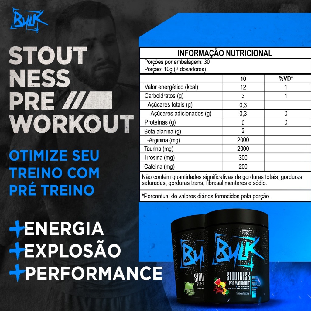 Se você está procurando um pré-treino que realmente faça a diferença na sua performance, temos uma ótima sugestão para você: o Stoutness Pre Workout da Bulk Nutrition. Com sua fórmula poderosa, este suplemento é capaz de potencializar seus treinos e garantir que você alcance seus objetivos de maneira mais eficiente. Imagine só: você está se preparando para um treino intenso e precisa de uma dose extra de energia e foco para conseguir dar o seu melhor. É aí que o Stoutness Pre Workout entra em cena! Com 2000mg de Beta Alanina, você vai sentir uma sensação de formigamento na pele, indicando que seus músculos estão sendo preparados para o exercício. A Arginina, por sua vez, é um aminoácido que ajuda na produção de óxido nítrico, melhorando a circulação sanguínea e garantindo uma maior entrega de nutrientes aos músculos durante o treino. E a taurina é um aminoácido que ajuda a reduzir a fadiga muscular, garantindo que você possa se esforçar ao máximo durante todo o exercício. Mas isso não é tudo: o Stoutness Pre Workout também conta com 200mg de Cafeína anidra por porção, que ajuda a aumentar a concentração e a disposição, além de melhorar a queima de gordura. E o melhor de tudo é que você pode escolher entre os deliciosos sabores de Maçã Verde ou Frutas Vermelhas! Agora imagine você se sentindo mais preparado e motivado para os seus treinos, conseguindo atingir seus objetivos com mais facilidade e rapidez. E o melhor de tudo é que a Bulk Nutrition oferece o melhor custo-benefício do mercado, já que a empresa comercializa seus produtos direto de fábrica, sem intermediários. Então por que não experimentar o Stoutness Pre Workout e ver a diferença por si mesmo? Garanto que você não vai se arrepender! COMPOSIÇÃO DO KIT: 2 unidades do Stoutness Pre Workout 300g (1 Maça Verde + 1 Frutas Vermelhas)