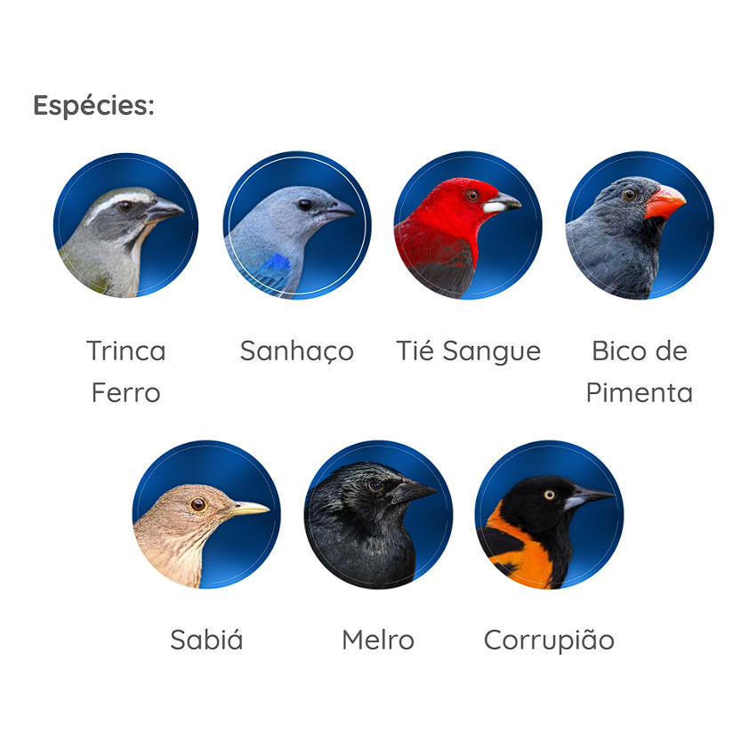 Composição Básica: Milho Moído*, Quirera de Arroz, Farelo de Soja**, Farelo de Glúten de Milho 60*, Grão de Linhaça, Grão de Aveia, Larva de Mosca Soldado Negra Desidratada, Semente de Cártamo, Óleo de Girassol Bruto, Gordura de Coco (0,5%), Azeite de Dendê (0,5%), Ovo em pó, Alho Desidratado (0,1%), Frutas Cristalizadas (5%), Pimenta Rosa (Schinus sp.), Biomassa de microalgas desidratada (Spirulina Platensis) (0,1%), Biomassa de microalgas (Schizochytrium sp.), Cloreto de Sódio, Prebióticos (Frutooligossacarídeos-FOS e Mananoligossacarídeos -MOS), Ácido Fólico, D-Pantotenato de Cálcio, Biotina, Vitamina C, Niacina, Cloreto de Colina, Vitamina A, Vitamina B1 (Tiamina), Vitamina B2 (Riboflavina), Vitamina B6 (Piridoxina), Vitamina B12, Vitamina D3, Vitamina E, Vitamina K3 (Menadiona), Inositol, Ferro Quelato, Cobre Quelato, Iodato de Cálcio, Sulfato de Cobalto, Sulfato de Manganês, Manganês Quelatado, Zinco Quelatado, Selênio Quelatado, Picolinato de Cromo, Calcário Calcítico, Fosfato Bicálcico, Sorbato de Potássio, Zeólita (1,5%), Ácido Cítrico, BHA, BHT, Aroma de Melaço, Aroma de Abacaxi. Espécies doadoras de genes: *Streptomyces viridochromogenes, Bacillus thuringiensis. **Agrobacterium tumefaciens. Ingredientes fixos sem eventuais substitutivos. Modo de uso: A Nutribiótica Super Premium Trinca Ferro Natural com Frutas e Pimenta é um alimento completo e balanceado para passeriformes nas fases de manutenção e reprodução. Enriquecimento por kg: Vitamina A (Mín.) 16.000UI, Vitamina D3 (Mín.) 1.600UI, Vitamina E (Mín.) 200UI, Vitamina C (Mín.) 800mg, Vitamina B1 (Mín.) 6,0mg, Vitamina B2 (Mín.) 10,0mg, Vitamina B6 (Mín.) 10,0mg, Vitamina B12 (Mín.) 40,0mcg, Vitamina K3 (Mín.) 4,0mg, Ácido Fólico (Mín.) 3,2mg, Ácido Pantotênico (Mín.) 53,0mg, Biotina (Mín.) 0,52mg, Niacina (Mín.) 93,0mg, Colina (Mín.) 665mg, Inositol (Mín.) 200mg, Cobre quelatado (Mín.) 13,0mg, Ferro quelatado (Mín.) 13,0mg, Iodo (Mín.) 1,7mg, Manganês (Mín.) 120mg, Manganês quelatado (Mín.) 26,0mg, Selênio quelatado (Mín.) 0,52mg, Zinco quelatado (Mín.) 132mg, BHT (Mín.) 100mg, BHA (Mín.) 100mg, Cobalto (Mín.) 0,16mg, Cromo (Mín.) 0,32mg. Garantia do vendedor: 90 dias