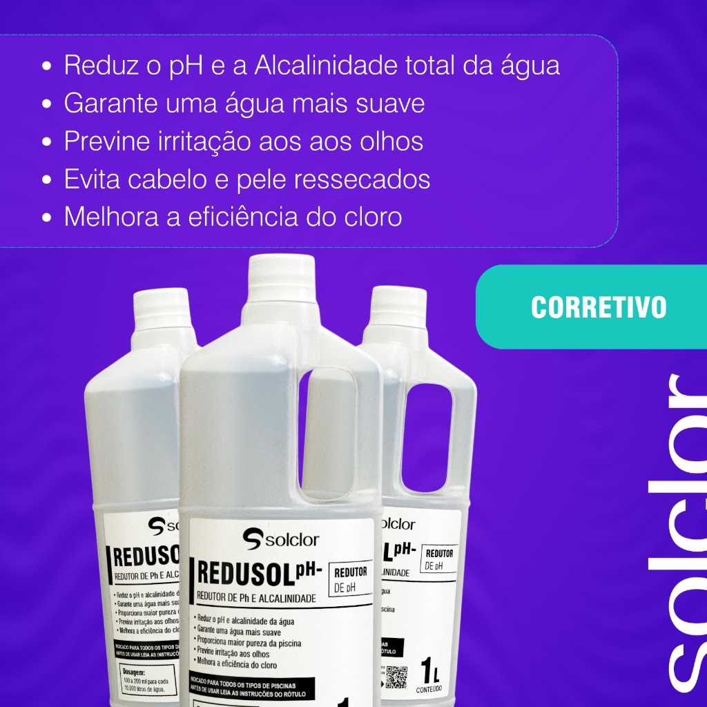 KIT COM 2 UNIDADES Funções: Reduz o pH da água / Reduz a alcalinidade da água / Garante uma água mais suave / Proporciona maior pureza da piscina / Previne irritação aos olhos / Evita cabelo e pele ressecados / Possui fácil aplicação / Melhora a eficiência do cloro / Não deixa resíduos Indicação: O Redutor de pH e Alcalinidade Redusol pH- ajusta o pH e a alcalinidade ao mesmo tempo e proporciona uma piscina com água agradável. Não deixa os olhos vermelhos, a pele ou os cabelos ressecados e garante pureza da água com eficiência total do cloro livre. Dispensa as correções frequentes, gerando economia e maior praticidade. Dosagem: Se o pH estiver entre 7,6 a 8,0 usar 10 ml para cada 1000 litros de água. Se o pH estiver acima de 8,0 use 20ml para cada 1000 litros de água. Aplicação: Para redução do pH a 7,5 quando estiver acima de 7,8: 1) Meça o pH da água. Para pH atual de 7,8 a 8,0, utilizar 10 ml de Redusol pH- e para pH atual acima de 8,0, utilizar 20 ml de Redusol pH- para cada 1.000 litros de água. 2) Acione o sistema de filtração na posição RECIRCULAR. 3) Dilua a dosagem recomendada de Redusol pH- para cada 1.000 litros em um balde plástico com a água da própria piscina e espalhe uniformemente sobre toda a superfície. Deixe recircular a água por aproximadamente 2 horas. 4) Reanalise o pH no dia seguinte para certificar-se de que está na faixa ideal recomendada de 7,2 e 7,6. Em caso negativo, repita a operação. Aplicação: Para redução da alcalinidade quando estiver acima de 200 ppm: 1) Meça a alcalinidade total da água. Para resultado acima de 200 ppm, utilizar 10 ml de Redusol pH-. 2) Dilua a dosagem recomendada de Redusol pH- para cada 1.000 litros em um balde plástico com a água da própria piscina e despeje em apenas um local específico da piscina, de preferência no lugar mais fundo. Deixe a água em repouso por aproximadamente 12 horas. 3) Após o repouso, acione o sistema de filtração na posição RECIRCULAR e recircule a água por aproximadamente 6 horas. 4) Reanalise a alcalinidade total da água no dia seguinte para certificar-se de que está na faixa ideal recomendada de 80 a 120 ppm. Em caso negativo, repita a operação. Atenção: Libere a piscina para uso somente 30 minutos após a adição do produto. Aspecto visual: Liquido incolor. Armazenagem: Armazenar o produto em sua embalagem original, em local fresco e bem arejado. Não reutilizar a sua embalagem.