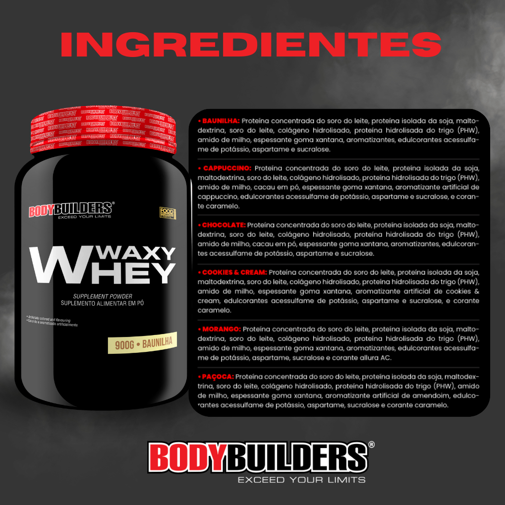 Waxy Whey – Bodybuilders Waxy Whey é um suplemento alimentar em pó formulado a partir de proteínas do soro do leite, proteínas vegetais e carboidratos, desenvolvido para complementar a ingestão diária de proteínas e carboidratos na alimentação. Produto disponível nos sabores Baunilha, Chocolate, Morango, Cappuccino e Paçoca. Ingredientes Sabor Baunilha: Proteína concentrada do soro do leite, proteína isolada da soja, maltodextrina, soro do leite, colágeno hidrolisado, proteína hidrolisada do trigo (PHW), amido de milho, aromatizantes, espessante goma xantana, antiumectante, edulcorantes acessulfame de potássio, aspartame e sucralose. Sabor Chocolate: Proteína concentrada do soro do leite, proteína isolada da soja, maltodextrina, soro do leite, colágeno hidrolisado, proteína hidrolisada do trigo (PHW), amido de milho, cacau em pó, aromatizantes, espessante goma xantana, antiumectante, edulcorantes acessulfame de potássio, aspartame e sucralose. Sabor Morango: Proteína concentrada do soro do leite, proteína isolada da soja, maltodextrina, soro do leite, colágeno hidrolisado, proteína hidrolisada do trigo (PHW), amido de milho, aromatizantes, espessante goma xantana, antiumectante, edulcorantes acessulfame de potássio, aspartame, sucralose e corante allura AC. Sabor Cappuccino: Proteína concentrada do soro do leite, proteína isolada da soja, maltodextrina, soro do leite, colágeno hidrolisado, proteína hidrolisada do trigo (PHW), amido de milho, cacau em pó, aromatizantes, espessante goma xantana, antiumectante, edulcorantes acessulfame de potássio, aspartame, sucralose e corante caramelo. Sabor Paçoca: Proteína concentrada do soro do leite, proteína isolada da soja, maltodextrina, soro do leite, colágeno hidrolisado, proteína hidrolisada do trigo (PHW), amido de milho, aromatizantes, espessante goma xantana, antiumectante, edulcorantes acessulfame de potássio, aspartame, sucralose e corante caramelo. Sugestão de consumo Adicionar 50 g (5 colheres de sopa rasas) em 300 ml de água ou outra bebida de sua preferência. Utilizar uma coqueteleira para facilitar a mistura. Pode ser preparado com outros ingredientes, conforme preferência. BCAA 4,5 g – Bodybuilders BCAA 4,5 g é um suplemento alimentar em pó composto por aminoácidos de cadeia ramificada (L-leucina, L-valina e L-isoleucina). Produto desenvolvido para complementar a ingestão desses aminoácidos na alimentação. Produto com sabor tangerina. Ingredientes Dextrose, L-leucina, L-valina, L-isoleucina, acidulante ácido cítrico, edulcorante sucralose, corante amarelo crepúsculo e aromatizante sintético idêntico ao natural de tangerina. Sugestão de consumo Adicionar 7,5 g em 200 ml de água ou outra bebida de sua preferência. Utilizar uma coqueteleira para facilitar a mistura. Avisos Este produto não é um medicamento. Não exceder a recomendação diária de consumo indicada na embalagem. Manter fora do alcance de crianças. Gestantes, nutrizes, crianças, idosos e pessoas com enfermidades devem consultar um profissional de saúde antes do consumo. Alérgicos: contém derivados de leite, soja, trigo e amendoim. Contém glúten. Contém lactose.