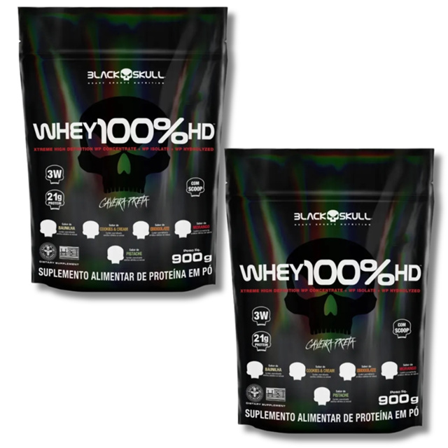 | Kit 2x Whey Protein Concentrado 100% HD 900g Refil Black Skull este produto | R$ 299,99 | 14% | — | 1 |