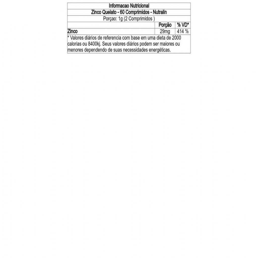 Kit/Combo composto dos seguintes produtos: 2 - Zinco Quelato - 60 Comprimidos - Nutralin Descrição - Zinco Quelato - 60 Comprimidos - Nutralin O Zinco Quelato da Nutralin é um suplemento mineral que está envolvido no processo de formação e ação de quase tudo no organismo. Auxilia a síntese das proteínas aumentando sua produção e absorção pelo organismo. Zinco é um mineral essencial para todas as vidas. Tem participação em funções como a síntese de proteínas, processo de crescimento, cicatrização, na resposta imune, na função neurológica e na reprodução. Como Tomar - Zinco Quelato - 60 Comprimidos - Nutralin Tomar 2 comprimidos ao dia com água ou conforme recomendação profissional. Não exceder a recomendação diária de consumo indicada na embalagem. Este produto não é um medicamento. Mantenha fora do alcance de crianças. Este suplemento é indicado para maiores de 19 anos. Ingredientes - Zinco Quelato - 60 Comprimidos - Nutralin Maltodextrina, amido, bisglicinato de zinco, estearato de magnésio, dióxido de silício e estabilizante polivinilpirrolidona. NÃO CONTÉM GLÚTEN. NÃO CONTÉM LACTOSE. NÃO CONTÉM AÇÚCAR. NÃO CONTÉM SOJA E DERIVADOS. ...