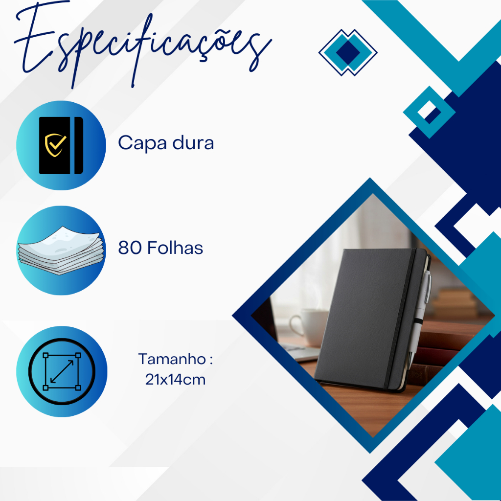 ATENÇÃO: SELECIONE A OPÇÃO DE QUANTIDADES CORRETA! Disponível em: 3 Unidades / 5 Unidades / 10 unidades Caderneta Profissional Premium - Elegância e Organização Esta caderneta de anotações combina sofisticação e funcionalidade, sendo o instrumento ideal para o profissional moderno que valoriza a qualidade e a organização. - Design Premium: Apresenta uma capa dura em couro sintético de alta durabilidade, conferindo um toque de distinção e resistência para o uso diário. - Formato Otimizado: Com dimensões de 14x21 cm (tamanho A5 aproximado), oferece o equilíbrio perfeito entre espaço generoso para escrita e portabilidade. - Conteúdo Ideal: Possui 80 folhas de alta qualidade, prontas para registrar ideias, reuniões, projetos e insights. - Folhas: com ou sem pauta; - Fechamento Seguro: Equipada com um elástico resistente para manter as páginas protegidas e o conteúdo discreto. Semelhante ao estilo Moleskine, é a escolha perfeita para executivos, estudantes e criativos que buscam um caderno elegante para acompanhar o seu dia a dia. Sugestões de Aplicação (Opcional): Ideal para brindes corporativos, presentes executivos ou para elevar o seu material de escritório.