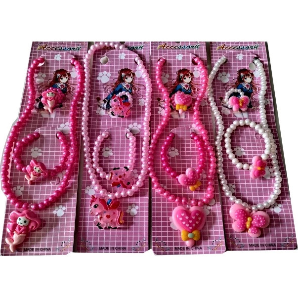 Pacote com 3/6/12 cartelas e cada cartela contém 1 colar com pingente, 1 pulseira com pingente e 1 anel com enfeite. Lindo acessório para as meninas! Composição: pérola sintética, plástico. OBSERVAÇÂO: Os modelos e os pingentes vão variados de acordo com o que temos em estoque. ENVIAS ALEATORIAS Garantimos que são lindos! Temos a pronta entrega. Adquira o seu!