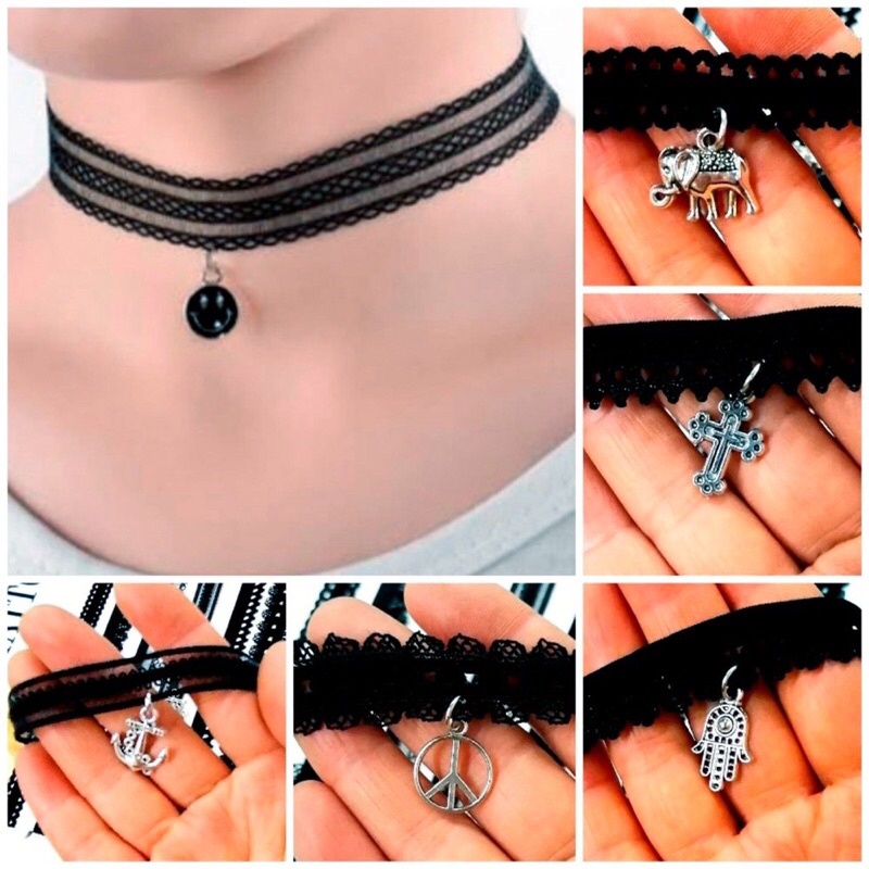- São posta as pingentes sortidas . - Colares em rendinha preta e pingentes - Comprimento: 30 cm (de ponta a ponta) , Possuem regulagem (extensor de 5 cm) - O material da rendinha permite que o colar estique, assim não fica apertado no pescoço). - Material: renda de elástico , pingente de metal - Qualquer duvida estamos a disposição da minha loja - Não aceita devoluçao ou troca os produtos fora da garantia do shopee , Ou após de uso .