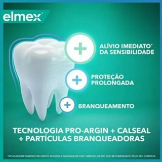 Descrição Do Produto Detalhes Conteúdo da embalagem: 3, 6, ou 12 Unidades de creme dental Elmex sensitive 30 gramas cada - DEPENDENDO DO KIT ADQUIRIDO Composição: Aqua, Calcium Carbonate, Sorbitol, Arginine Bicarbonate, Hydrated Silica, Sodium Lauryl Sulfate, Aroma, Sodium Monofluorophosphate, Cellulose Gum, Sodium Bicarbonate, Tetrasodium Pyrophosphate, Tricalcium Phosphate, Sodium Saccharin, Benzyl Alcohol, Xanthan Gum, CI 77891, Limonene. Contém Monofluorfosfato de Sódio / Contiene Monofluorofosfato de Sodio (1450 ppm de Flúor); Eficaz para dentes sensíveis; Marca Suíça; Clinicamente comprovado; Fortalece e ajuda a remineralizar o esmalte enfraquecido, protegendo contra a cárie. Aplicação Para que serve a pasta Elmex Sensitive? O Creme Dental para dentes sensíveis Elmex Sensitive é indicado para pacientes com hipersensibilidade, pois promove alívio imediato. Qual a recomendação do fabricante para pacientes que buscam alívio imediato usando a Elmex pasta de dente? Para alívio imediato, aplique Elmex creme dental no dente sensível e massagear por 1 minuto, desde que recomendado pelo dentista. Para proteção prolongada, use regularmente. Benefícios Pasta de dente Elmex sensitive O Creme de dente Elmex Sensitive, fabricado pela Elmex, produzido com a tecnologia Suíça, propõe alívio imediato, proteção prolongada, além de fortalecer o esmalte dos dentes. O Creme dental Elmex Sensitive é ideal para pacientes com hipersensibilidade, pois possui a tecnologia Pro-Argin + CalSeal + partículas branqueadoras, que em sua fórmula exclusiva restaura o branco natural do dente sem causar mais sensibilidade.