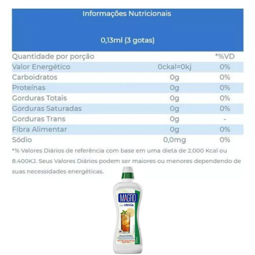 | Kit 3 Adoçante C/ Stevia Líquido 65ml - Magro este produto | R$ 32,00 | — | 4.9/5 | 5 |