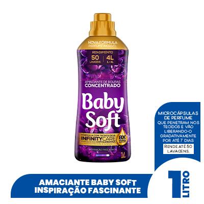 O Amaciante Concentrado Baby Soft Inspiração Fascinante foi pensado para quem quer maciez e suavidade, mas não abre mão de um perfume marcante e duradouro nas roupas. Com apenas meio litro dos amaciantes Concentrados Baby Soft você pode fazer até 25 lavagens. Descrição Média 1.Vantagens Rende até 25 lavagens. Além de todo este poder, eles têm uma formulação especial com cápsulas de perfume que são ativadas durante a lavagem, para que o seu efeito seja prolongado e o perfume dure por mais tempo. 2.Características do produto (medidas/especificar quando houver variação do mesmo produto) Os nossos amaciantes concentrados possuem 8 X mais perfume e são formulados com queratina em sua composição, que permite muito mais maciez e profundo cuidado com as fibras dos tecidos! Sem falar que todas as nossas embalagens são feitas de plástico PET, permitindo reciclagem de 100% do material. Baby Soft é uma marca consciente e sustentável! Mas afinal, o que é um amaciante concentrado? Vem cá que eu te conto! Apesar de ter uma embalagem menor que a versão tradicional, o amaciante concentrado costuma render muito mais, pois sua fórmula possui mais ativos do que água, ou seja, com menos produto você tem mais maciez e perfume. Além desses benefícios, o Amaciante Concentrado Baby Soft é: Hipoalergênico Dermatologicamente testado Garante o cuidado que você e sua família merecem. Produto não testado em animais Detalhes técnicos: Unidade: Embalagem com Amaciante Concentrado Baby Soft Inspiração Fascinante 1L Vida útil: 24 meses 3.Composição (do que é feito o produto)/ Especificações técnicas Sal De Amônio Quaternário Coadjuvante Conservante Corantes Fragrâncias Veículo Descrição Longa 4. Modo de usar (o da embalagem) Siga sempre as instruções de lavagem contidas nas etiquetas das roupas e nunca despeje o produto diretamente sobre as roupas. Após uma operação de lavagem, realize mais um enxágue, dissolvendo em separado 1/2 tampa de Baby Soft em água limpa e sem resíduo de sabão. Deixe agir por 10 minutos e complete o processo. 5. Dica de Gê Se você busca saber qual amaciante é melhor, eu conto pra você! Existem os amaciantes diluídos e os concentrados, e Baby Soft oferece os dois pra você! O amaciante tradicional ou clássico é aquele encontrado com mais facilidade nas prateleiras. Ele é diluído em água e, geralmente, vem em garrafas de 500ml a 5 litros. É um dos tipos mais práticos para o dia a dia, já que vem pronto, ou seja, basta acrescentar à sua lavagem. Já a versão concentrada do produto é também líquida, porém mais espessa do que o amaciante tradicional. O seu nome se dá porque ele tem menos água na sua fórmula, portanto, o produto é mais puro, logo, mais concentrado. Ele rende uma quantidade maior de lavagens do que a sua versão diluída e, por conta da concentração, deve ser usado em quantidades menores.