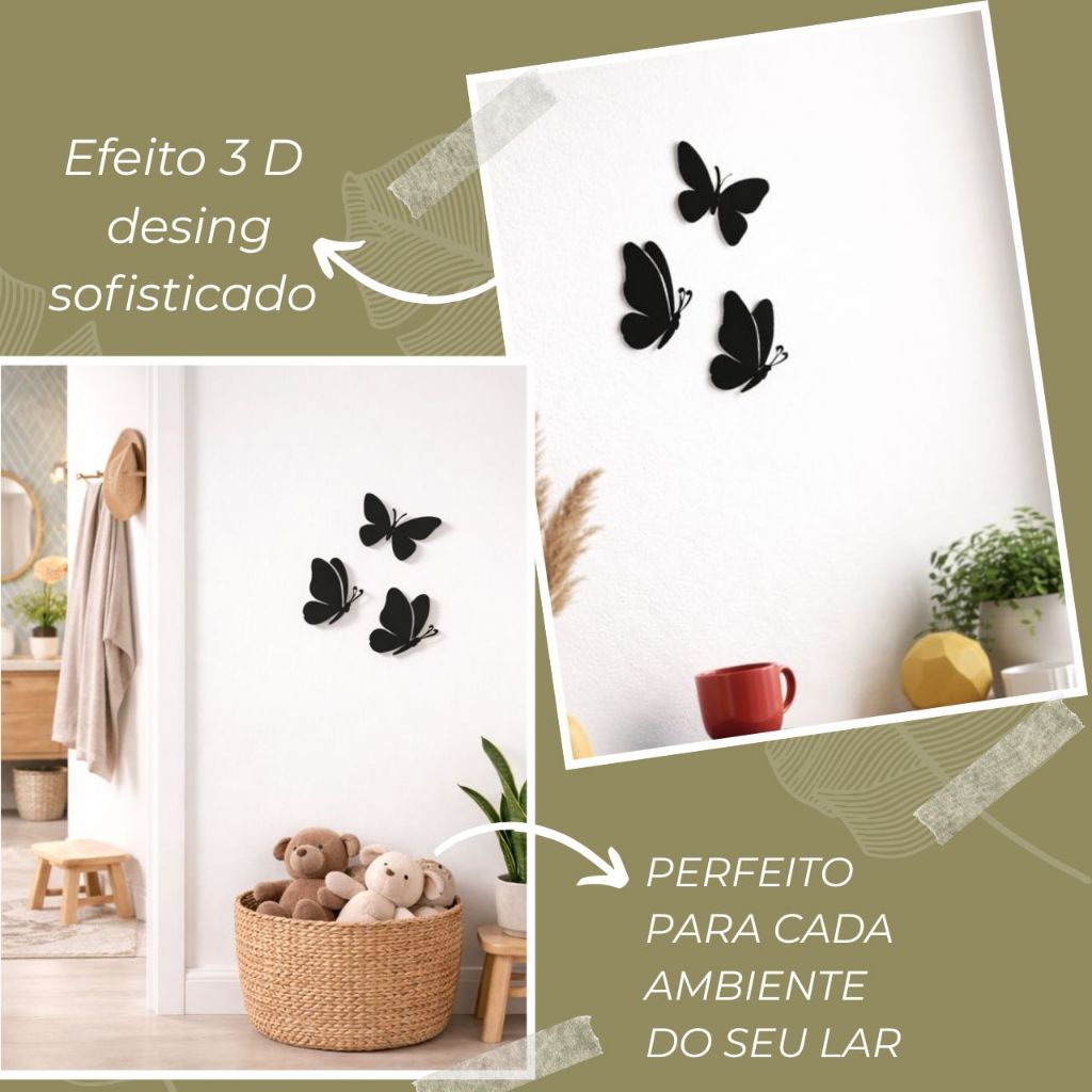 Aplique de Parede Borboletas Minimalistas – Elegância e Charme para o Seu Lar Transforme o ambiente da sua casa com um toque delicado e moderno! Esses apliques de parede de borboletas minimalistas são perfeitos para donas de casa que amam decoração prática, elegante e cheia de vida. Feitos com tinta preta premium, garantem acabamento impecável, alta durabilidade e um visual sofisticado em qualquer parede. DETALHES: - Material prima: Mdf ecológico - Cor : Preto Premium - Espessura: 3mm ITENS INCLUSOS: - Kit 3 Apliques Borboletas Delicadas ( 1 - 7 cm 7 cm ) ( 2 - 7 cm x 7 cm ) ( 3 - 7cm x 7 cm ) - FITA DUPLA FACE ** Por que você vai amar: Fácil de aplicar: sem sujeira e sem precisar de ferramentas. Design moderno e minimalista: combina com qualquer estilo de decoração. Feito com tinta preta premium: cores vivas, resistentes e elegantes. Ideal para sala, quarto, cozinha ou escritório: um charme em qualquer ambiente. Produto artesanal com qualidade e amor – porque cada detalhe da sua casa importa. DICAS: - Para limpeza utilize apenas um pano seco, não utilize produtos químicos, para garantir a durabilidade. - É indicado aplicar as peças em parede que sejam lisas. Mais vendido! Garanta já o seu antes que acabe e leve mais beleza para o seu cantinho favorito. Envio rápido e embalagem segura – satisfação garantida!