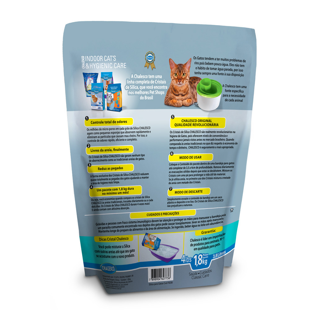 A Areia Sanitária Cristais de Sílica Chalesco é o produto com o melhor custo x benefício do mercado, de fácil manutenção e confortável para seu gato! Com excelente durabilidade e absorção, dura até 30 dias. Sua matéria prima é natural (água, areia e oxigênio), não oferece nenhum tipo de risco aos felinos e nem aos seres humanos. - Indicada para gatos; - Proporciona maior absorção das necessidades do seu felino; - É super econômica e mais durável; - Elimina o mau cheiro de fezes e urina; - Não é tóxica, - Disponível em embalagem de 1,8 kg.