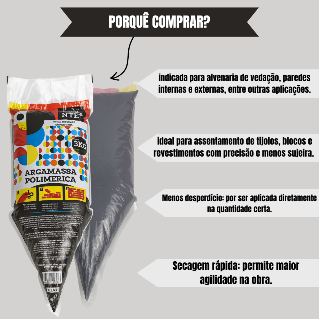 Experimente a Argamassa Polimérica Excellente e desfrute de inúmeros benefícios! Como ela já vem pronta, basta cortar a embalagem e começar a usar. Com isso, reduz-se o tempo de construção, evita sujeira no canteiro e desperdício de material, reduzindo o custo da sua obra! Vantagens: Resistência e Flexibilidade: Ela possui uma excelente adesão aos mais diversos materiais, como tijolos, blocos de concreto, blocos cerâmicos, blocos CCA e bloco solo cimento. Além disso, essa argamassa possui flexibilidade, o que diminui o risco de fissuras e trincas. Impermeabilização: Sua composição permite a formação de uma barreira resistente à penetração de água, óleo e outras substâncias líquidas, tornando-a ideal para aplicações em áreas sujeitas a umidade, como cozinhas, banheiros e áreas externas. Facilidade de Aplicação: A Argamassa permite uma aplicação mais homogênea e uniforme, reduzindo o esforço físico durante o trabalho, tornando-o mais ágil e produtivo. Sustentável: Por ser previamente misturada e vir pronta para uso, gera muito menos resíduos, desperdício e sujeira no local da construção. Alto Rendimento: Utilizando de apenas dois filetes de 1 cm para assentar tijolos e blocos, substitui-se 500 kg de argamassa convencional com apenas 30 kg de massa polimérica. Eficiência: Redução significativa de peso e volume transportado, facilitando a logística e o manuseio no canteiro de obras. Redução de Custos: Sua facilidade de aplicação e adesão a diversos materiais permitem uma execução mais rápida e com menos desperdício, reduzindo os gastos com retrabalhos e aumentando a produtividade da equipe. Durabilidade e Longevidade: A alta resistência mecânica da argamassa polimérica contribui para sua durabilidade e longevidade. Ela é capaz de suportar cargas, movimentações estruturais e variações climáticas sem comprometer sua integridade, o que resulta em uma vida útil mais longa e menor necessidade de manutenção. Dados técnicos: Produto: Massa Polimérica para assentamento de alvenaria Modelo: Bisnaga 3kg Rendimento: Máximo de até 2m² de alvenaria (tijolo e blocos) Peso: 3kg