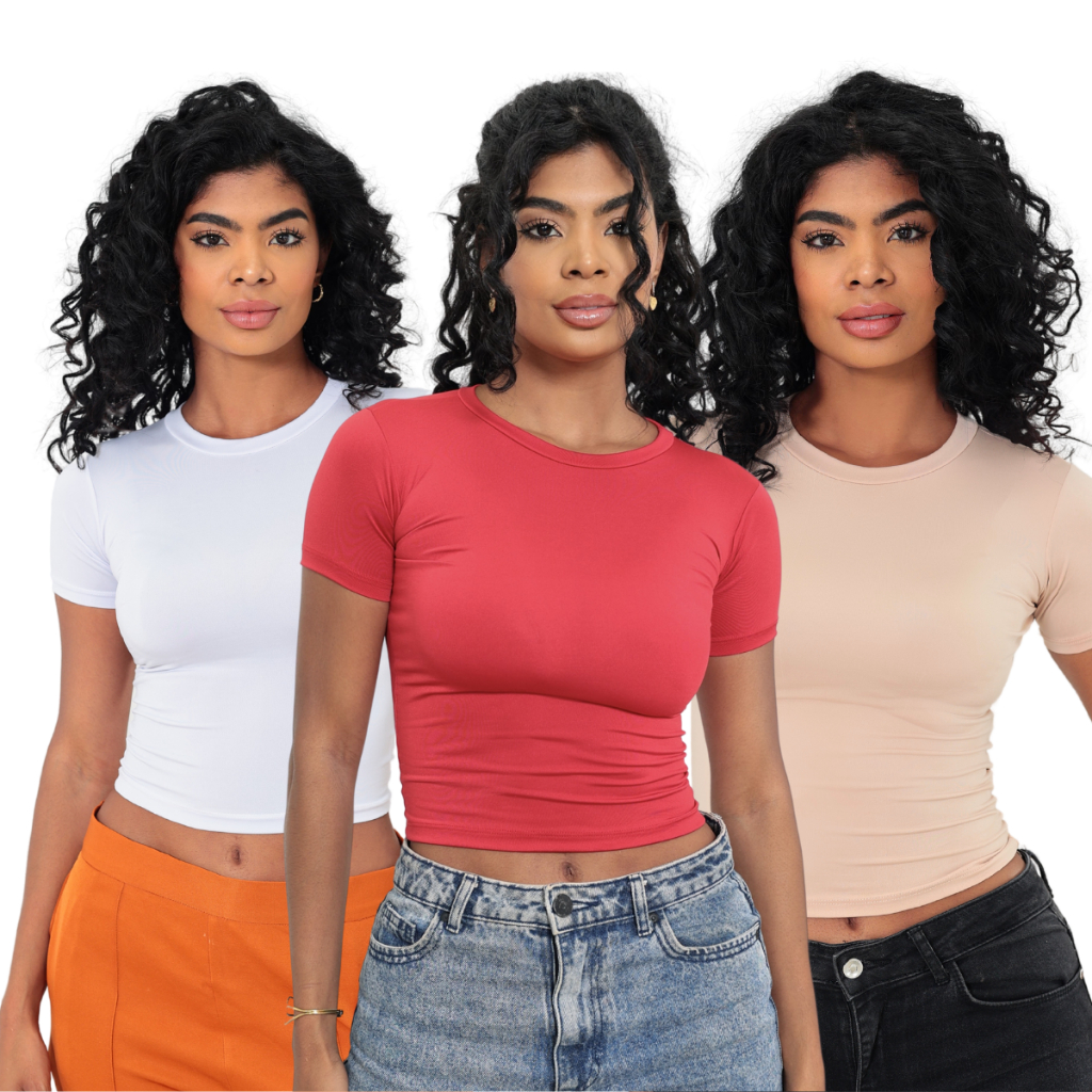 KIT 3: Baby Tee Feminina - Blusa Slim Fit Manga Curta - Blusa de Compressão
