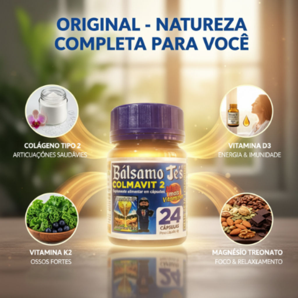 Bálsamo Je's Premium - Produto Importado e Original – Pronta entrega. Principais Características: - Produto 100% natural com Colágeno Tipo II, Ômega 3 e Algas Marinhas - Apenas 1 cápsula ao dia – ação prolongada por até 24h - Contém 24 cápsulas de 200mg - Produto original, lacrado e com pronta entrega - Não contém glúten Composição do Bálsamo Je's Premium: - Colágeno Tipo 2 (40mg) - Vitamina D3 (5mcg) - Magnésio Dimalato (63mg) - Vitamina K2 (55mcg) - Ômega 3 e Algas Marinhas Apresentação: Pote com 24 cápsulas de 200mg – Uso adulto (acima de 18 anos). Modo de Uso: Tomar 1 cápsula por dia após a refeição, até o alívio completo dos sintomas. Não exceder a dose recomendada. Contraindicações: Não recomendado para gestantes, lactantes, crianças menores de 18 anos, alérgicos a anti-inflamatórios ou qualquer um dos componentes da fórmula. Consultar um médico em caso de condições pré-existentes, como hipertensão, diabetes ou doenças cardíacas. Cuidados: Não ingerir com bebidas alcoólicas. - Armazenar em local seco e fresco, à temperatura ambiente. - Manter fora do alcance de crianças. Atenção: O Bálsamo Je's Premium não é um medicamento, é um suplemento alimentar que auxilia no alívio de dores articulares e musculares. Se houver reações adversas, como vermelhidão, inchaço ou dor abdominal, suspenda o uso imediatamente e procure orientação médica. Perguntas Frequentes (FAQ) 1. É um medicamento? Não. O Bálsamo Je’s é um suplemento alimentar natural e não deve substituir tratamentos médicos. 2. Quanto tempo leva para fazer efeito? Em muitos casos, o alívio começa após os primeiros dias de uso. O efeito pode variar conforme o organismo. 3. Pode ser tomado por diabéticos, hipertensos ou cardíacos? Recomendamos que esses grupos consultem um médico antes do uso, por precaução. 4. Pode tomar mais de uma cápsula por dia? Não. A dose recomendada é de 1 cápsula ao dia. Ultrapassar essa dose pode causar efeitos adversos. 5. Pode ser usado por idosos? Sim! O suplemento é ideal para auxiliar na manutenção da mobilidade e no fortalecimento das articulações na terceira idade. 6. Tem efeitos colaterais? Quando usado corretamente, é bem tolerado. Em casos raros, pode causar vermelhidão, retenção de líquidos ou desconfortos gastrointestinais. Se isso ocorrer, suspenda o uso e procure um médico. 7. Posso tomar junto com outros suplementos ou medicamentos? Consulte um profissional de saúde para evitar interações entre compostos. 8. Contém glúten? Não. O produto é livre de glúten. 9. É aprovado pela Anvisa? Como suplemento alimentar, segue as normas da Anvisa para esse tipo de produto.