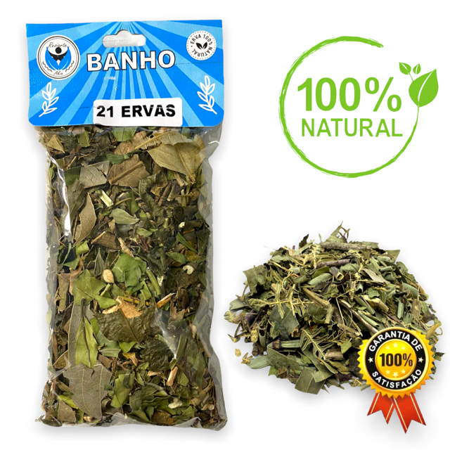 KIT C/ 3 BANHOS 21 ERVAS - TOP - COMPLETO - ERVAS SELECIONADAS INFORMAÇÕES SOBRE O PRODUTO Embalagem: aproximadamente 36g Rendimento: Rende até 3 banhos Sugestão de Uso: Ferva 300 ml de água e acrescente as ervas (use aproximadamente 1/3 do pacote). Tampe e deixe por 10 minutos. Logo após, coe e acrescente com água do chuveiro. Após o banho, finalize jogando do pescoço para baixo. * O banho contém as seguintes ervas: Aroeira folha, pitanga, boldo, arruda, alecrim, manga, cana do brejo, cha bugre, alfazema, malva, carobinha, abacateiro, capim santo, jambolão, cavalinha, capim rosário, samambaia, pata de vaca, espada de são Jorge, colônia e manjericão