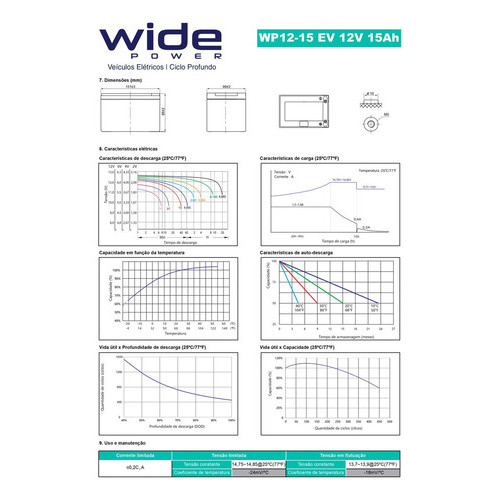 Bateria com 6 meses de garantia! Bateria de primeira linha, melhor que a original de bicicletas elétricas como Popbike ou Scooter Elétrica. Marca: WIDE Garantia: 6 meses Bateria de CICLO PROFUNDO, garante maior durabilidade mesmo após anos. Projetada especialmente para uso em bicicletas elétricas, em que ocorrem cargas e descargas contínuas diariamente. Tensão nominal de 12V e capacidade nominal de 15Ah para uma potência constante. Dimensões 15x10x10 cm (comprimento, altura, largura) e peso de aproximadamente 4,3 kg. BATERIA DE 15AH A unidade de medida Ah se refere à capacidade da bateria. Portanto, se a bateria original da sua bicicleta era de 12Ah ou 16Ah, a bateria deste anúncio é compatível na sua bicicleta elétrica. COMO CONSERVAR E CUIDAR DA SUA BATERIA Para preservar a bateria da sua bicicleta elétrica, siga estas orientações: Evite descarregar completamente a bateria; Não deixe a bateria por muito tempo sem carga; Não mantenha a bicicleta parada por vários dias com a bateria descarregada. Carregue até 100% antes de armazenar; Armazene em local arejado, evitando umidade excessiva; Sempre que possível, carregue até 100%; Use carregador confiável com a mesma tensão nominal da sua bicicleta (4 baterias de 12V = 48V). Seguindo essas dicas, você evita a sulfatação e reduz o desgaste natural da bateria. APLICAÇÕES: Bicicletas: Souza, Duos, Bike Pop, Veloster, Bio Bike, Lev, Dropboard, Eco Bikes Scooters elétricas em geral (verifique as medidas da sua bateria) Outros veículos elétricos como patinetes, skates, triciclos e motos elétricas Sistemas de nobreaks em geral CONTEÚDO DA EMBALAGEM Kit 3 Baterias Originais Wide 6x Parafusos para fixação dos fios nos terminais ATENÇÃO Garantia válida somente para defeitos de fabricação; não cobre danos por mau uso ou instalação incorreta. Em caso de dúvida, entre em contato antes de concluir a compra.