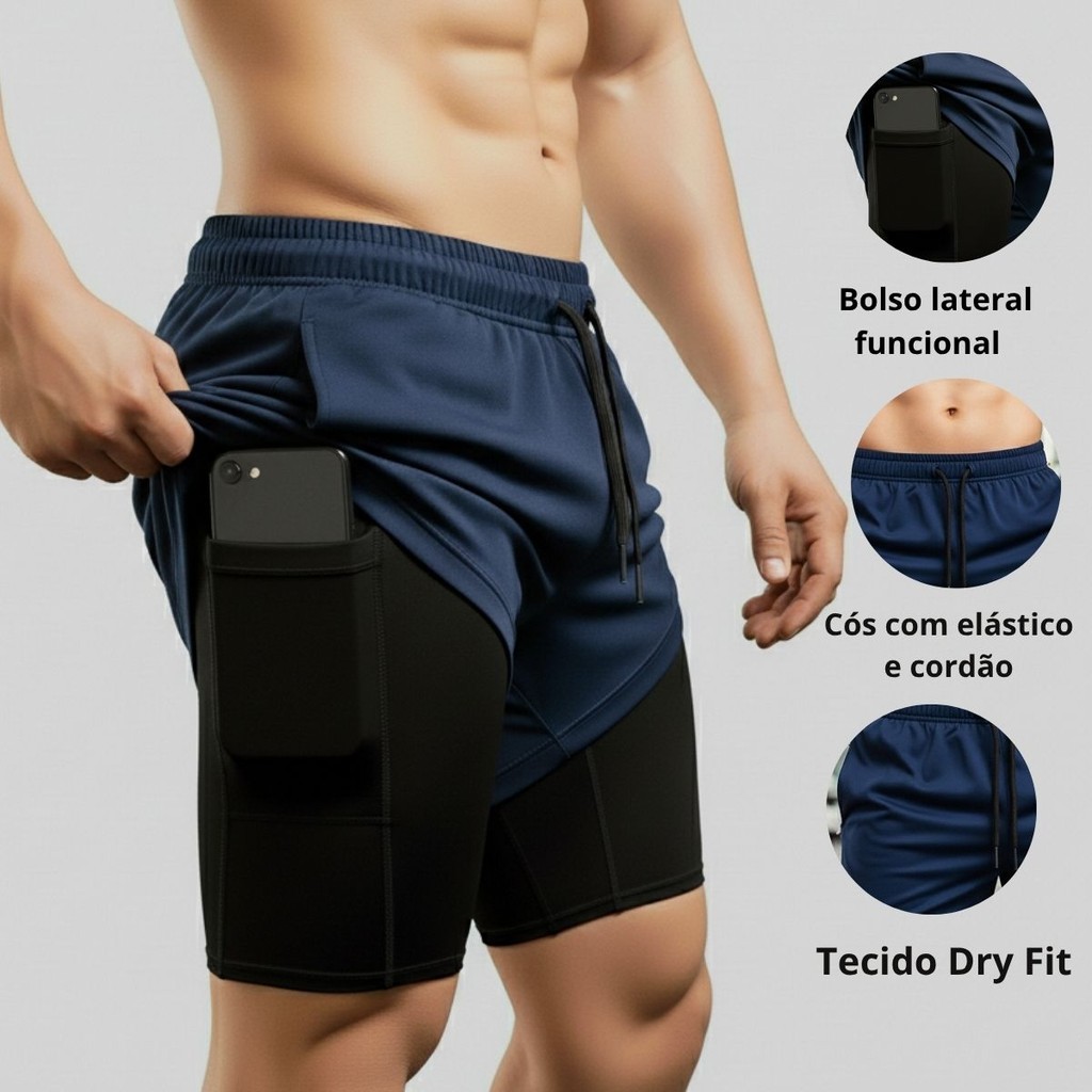 Kit 3 Bermudas 2 em 1 Masculinas Esportivas Shorts Para Academia e Corrida com Bolso Para Celular