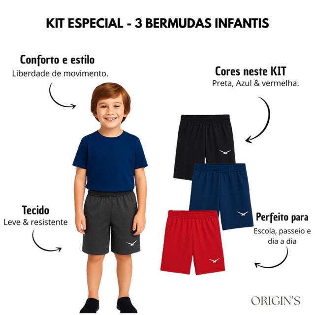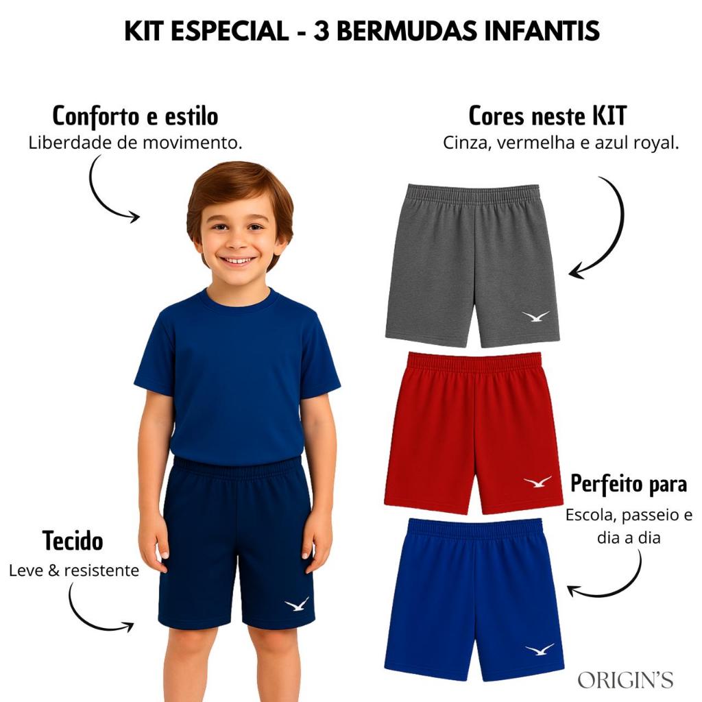 *Bermuda Infantil - Conforto e Estilo no Dia a Dia* --------------------------------------------TABELA DE MEDIDAS NAS FOTOS----------------------------------------------------- -------------------------------ESCOLHA ENTRE 1 E 3 UNIDADES DA COR QUE PREFERIR------------------------------------------ Bermuda infantil masculina ideal para o uso diário. Confeccionada em tecido leve e resistente, oferece conforto, mobilidade e durabilidade. Possui cós com elástico que se ajusta ao corpo da criança, modelagem soltinha e logo bordada que garante um toque de estilo à peça. ✅ Tecido confortável e resistente ✅ Cós com elástico para melhor ajuste ✅ Ideal para escola, passeios e lazer ✅ Logo com acabamento de qualidade ✅ Disponível em diversas cores e tamanhos Perfeita para compor looks práticos e estilosos todos os dias!